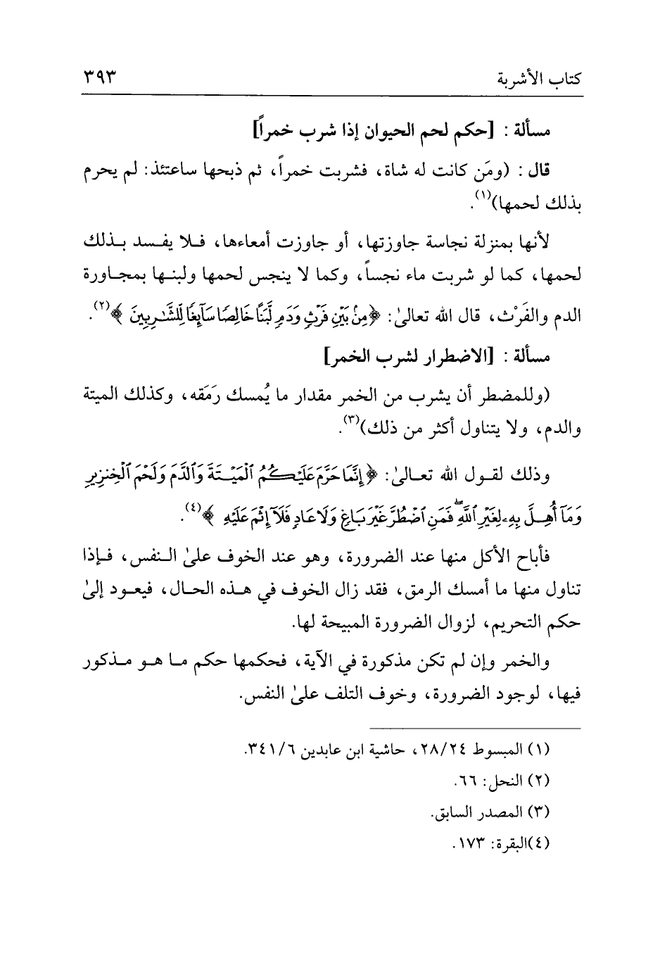 والخمر وإن لم تكن مذكورة في الآية، فحكمها حكم ما هو مذكور فيها، لوجود الضرورة، وخوف التلف على النفس.