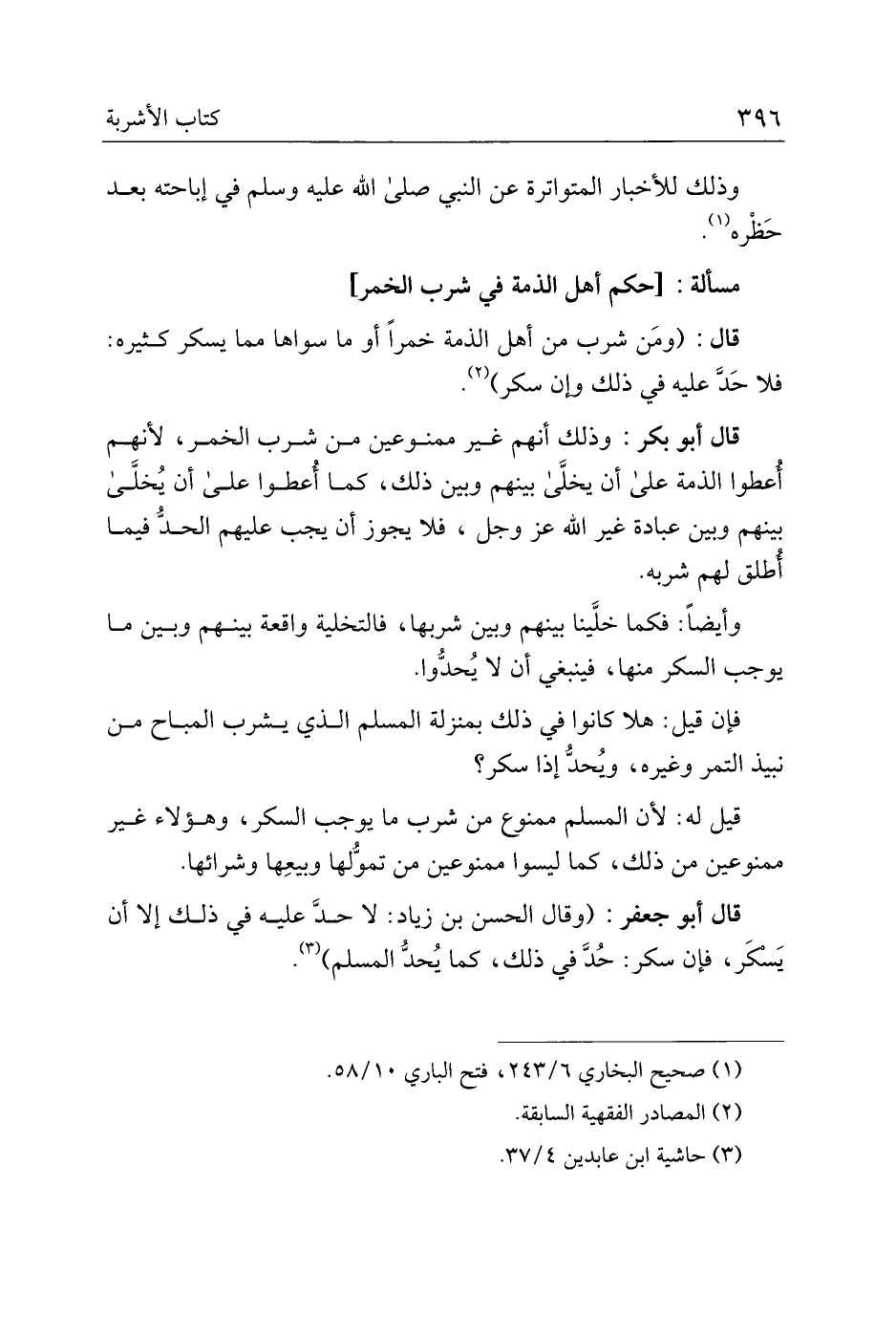 قال أبو بكر: وذلك أنهم غير ممنوعين من شرب الخمر، لأنهم أعطوا الذمة على أن يخلى بينهم وبين ذلك، كما أعطوا على أن يخلى بينهم وبين عبادة غير الله عز وجل، فلا يجوز أن يجب عليهم الحد فيما أطلق لهم شربه.