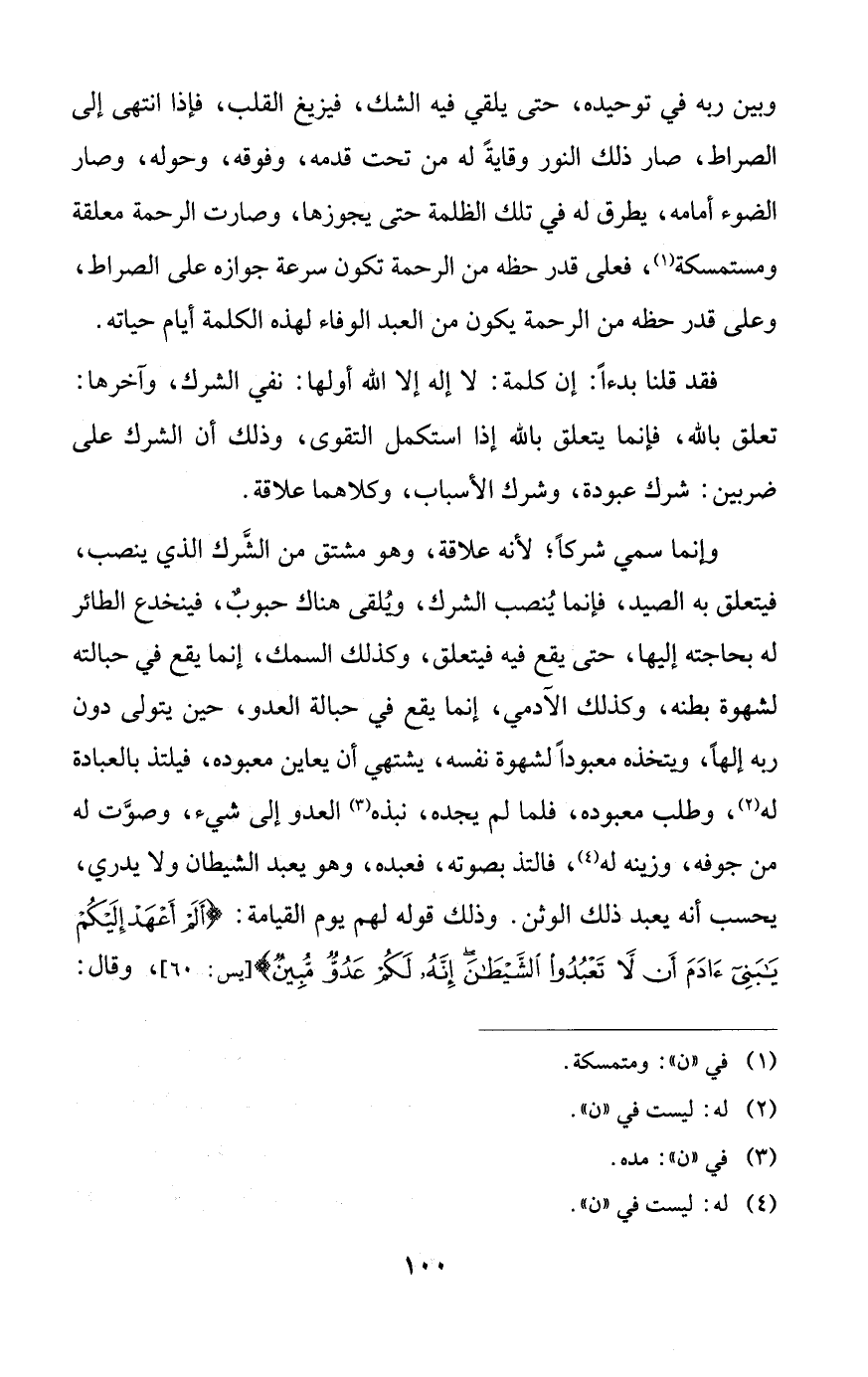 وإنما سمي شركاً؛ لأنه علاقة، وهو مشتق من الشرك الذي ينصب، فيتعلق به الصيد، فإنما ينصب الشرك، ويلقى هناك حبوبٌ، فينخدع الطائر له بحاجته إليها، حتى يقع فيه فيتعلق، وكذلك السمك، إنما يقع في حبالته لشهوة بطنه، وكذلك الآدمي، إنما يقع في حبالة العدو، حين يتولى دون ربه إلهاً، ويتخذه معبوداً لشهوة نفسه، يشتهي أن يعاين معبوده، فيلتذ بالعبادة له، وطلب معبوده، فلما لم يجده، نبذه العدو إلى شيء، وصوت له من جوفه، وزينه له، فالتذ بصوته، فعبده، وهو يعبد الشيطان ولا يدري، يحسب أنه يعبد ذلك الوثن. وذلك قوله لهم يوم القيامة: {ألم أعهد إليكم يا بني آدم أن لا تعبدوا الشيطان إنه لكم عدوٌ مبينٌ}، وقال: