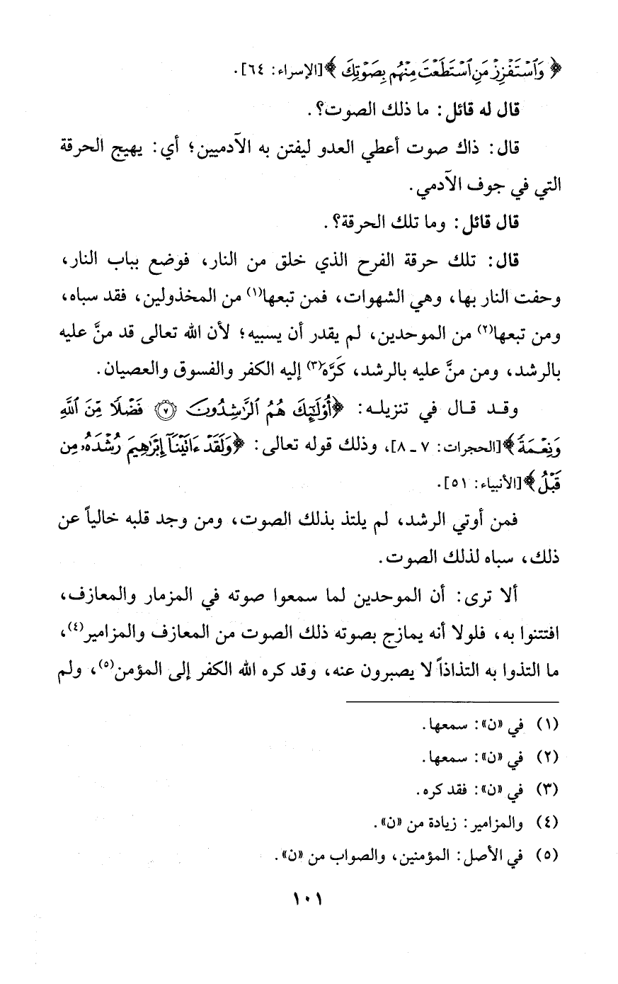ألا ترى: أن الموحدين لما سمعوا صوته في المزمار والمعازف، افتتنوا به، فلولا أنه يمازج بصوته ذلك الصوت من المعازف والمزامير، ما التذوا به التذاذاً لا يصبرون عنه، وقد كره الله الكفر إلى المؤمن، ولم