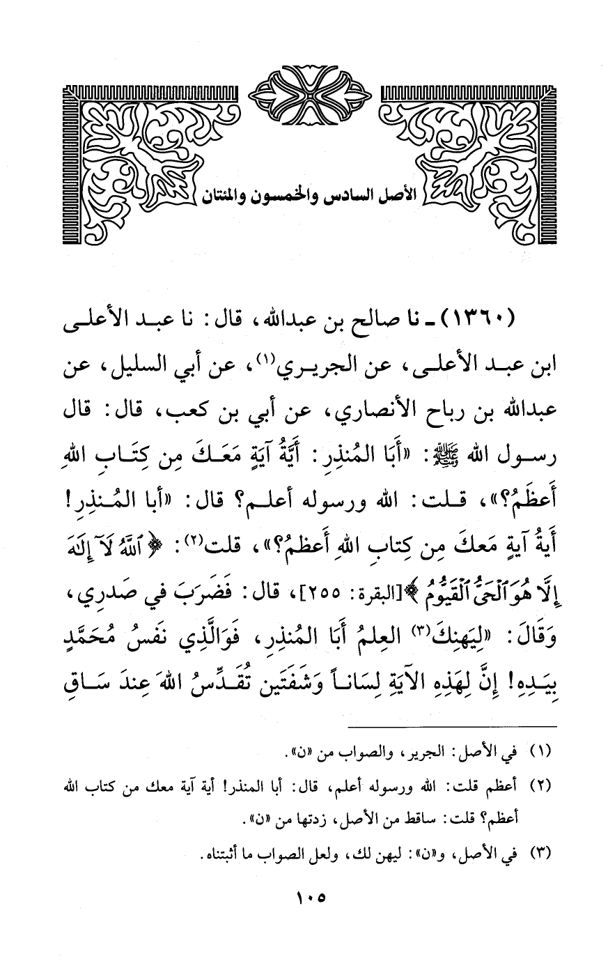 1360 - نا صالح بن عبد الله، قال: نا عبد الأعلى ابن عبد الأعلى، عن الجريري، عن أبي السليل، عن عبد الله بن رباح الأنصاري، عن أبي بن كعب، قال: قال رسول الله صلى الله عليه وسلم: ((أبا المنذر: أية آيةٍ معك من كتاب الله أعظم؟))، قلت: الله ورسوله أعلم؟ قال: ((أبا المنذر! أية آيةٍ معك من كتاب الله أعظم؟))، قلت: {الله لا إله إلا هو الحي القيوم}، قال: فضرب في صدري، وقال: ((ليهنك العلم أبا المنذر، فوالذي نفس محمدٍ بيده! إن لهذه الآية لساناً وشفتين تقدس الله عند ساق