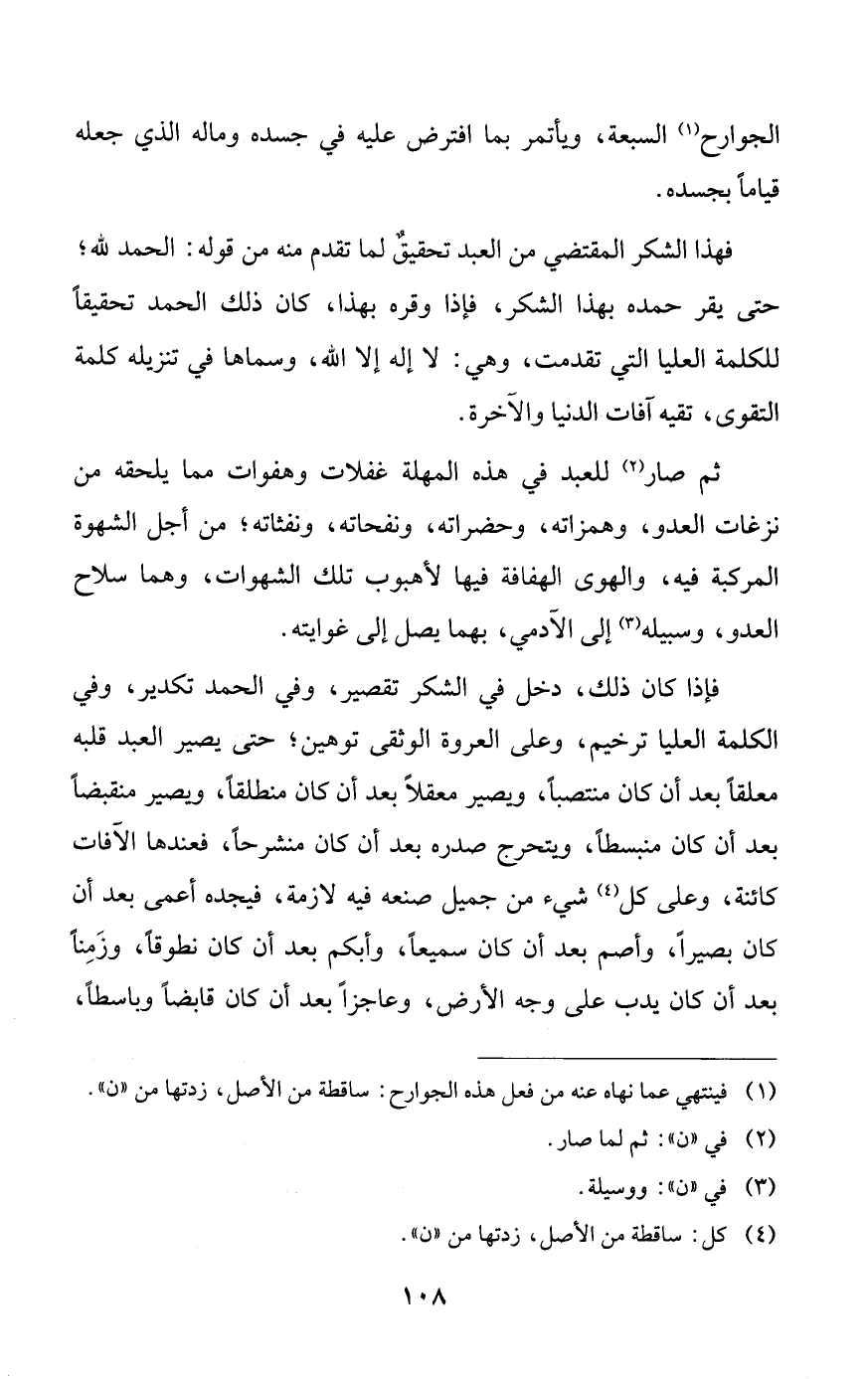فهذا الشكر المقتضي من العبد تحقيقٌ لما تقدم منه من قوله: الحمد لله؛ حق يقر حمده بهذا الشكر، فإذا وقره بهذا، كان ذلك الحمد تحقيقاً للكلمة العليا التي تقدمت، وهي: لا إله إلا الله، وسماها في تنزيله كلمة التقوى، تقيه آفات الدنيا والآخرة.