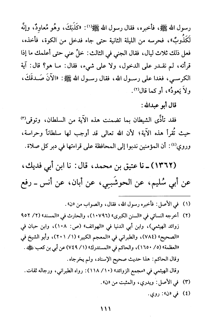 رسول الله صلى الله عليه وسلم، فأخبره، فقال رسول الله صلى الله عليه وسلم: ((كذبك، وهو معاودٌ، وإنه لكذوبٌ))، فحرسه من الليلة الثانية حتى جاء فدخل من الكوة، فأخذه، فعل ذلك ثلاث ليال، فقال الجني في الثالث: خل عني حتى أعلمك ما إذا قرأته، لم نقدر على الدخول، ولا على شيء، فقال: ما هو؟ قال: آية الكرسي، فغدا على رسول الله صلى الله عليه وسلم، فقال رسول الله صلى الله عليه وسلم: ((الآن صدقك، ولا يعود))، أو كما قال.
