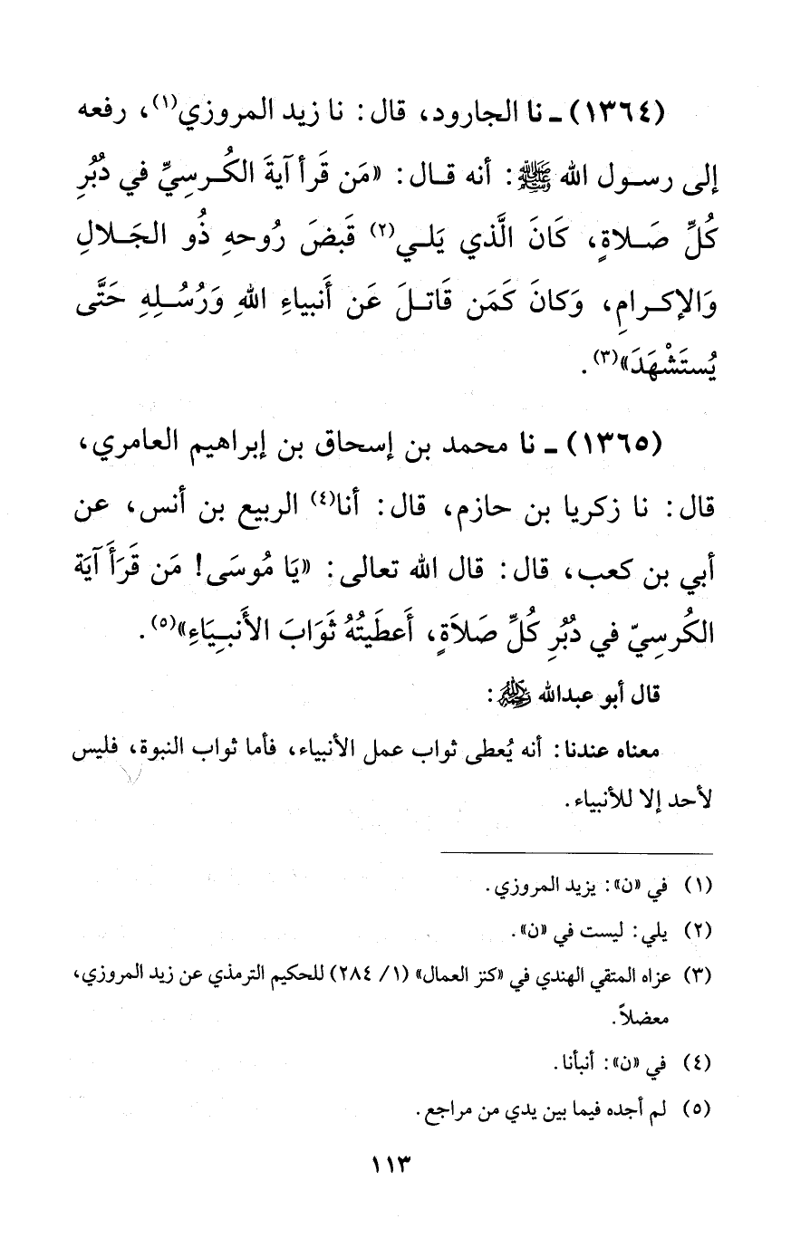 1364 - نا الجارود، قال: نا زيد المروزي، رفعه إلى رسول الله صلى الله عليه وسلم: أنه قال: ((من قرأ آية الكرسي في دبر كل صلاةٍ، كان الذي يلي قبض روحه ذو الجلال والإكرام، وكان كمن قاتل عن أنبياء الله ورسله حتى يستشهد)).