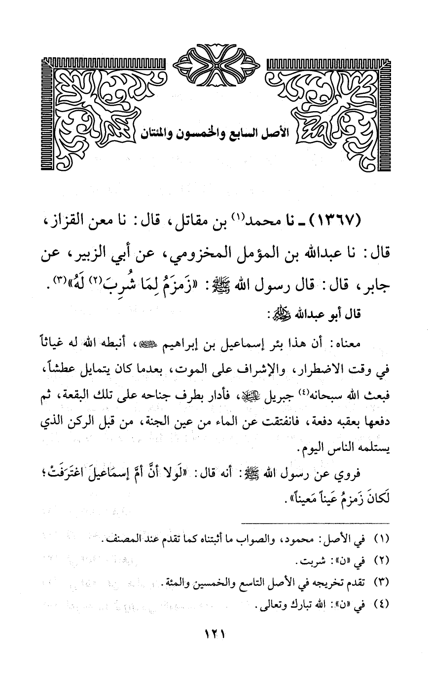 1367 - نا محمد بن مقاتل، قال: نا معن القزاز، قال: نا عبد الله بن المؤمل المخزومي، عن أبي الزبير، عن جابر، قال: قال رسول الله صلى الله عليه وسلم: ((زمزم لما شرب له)).