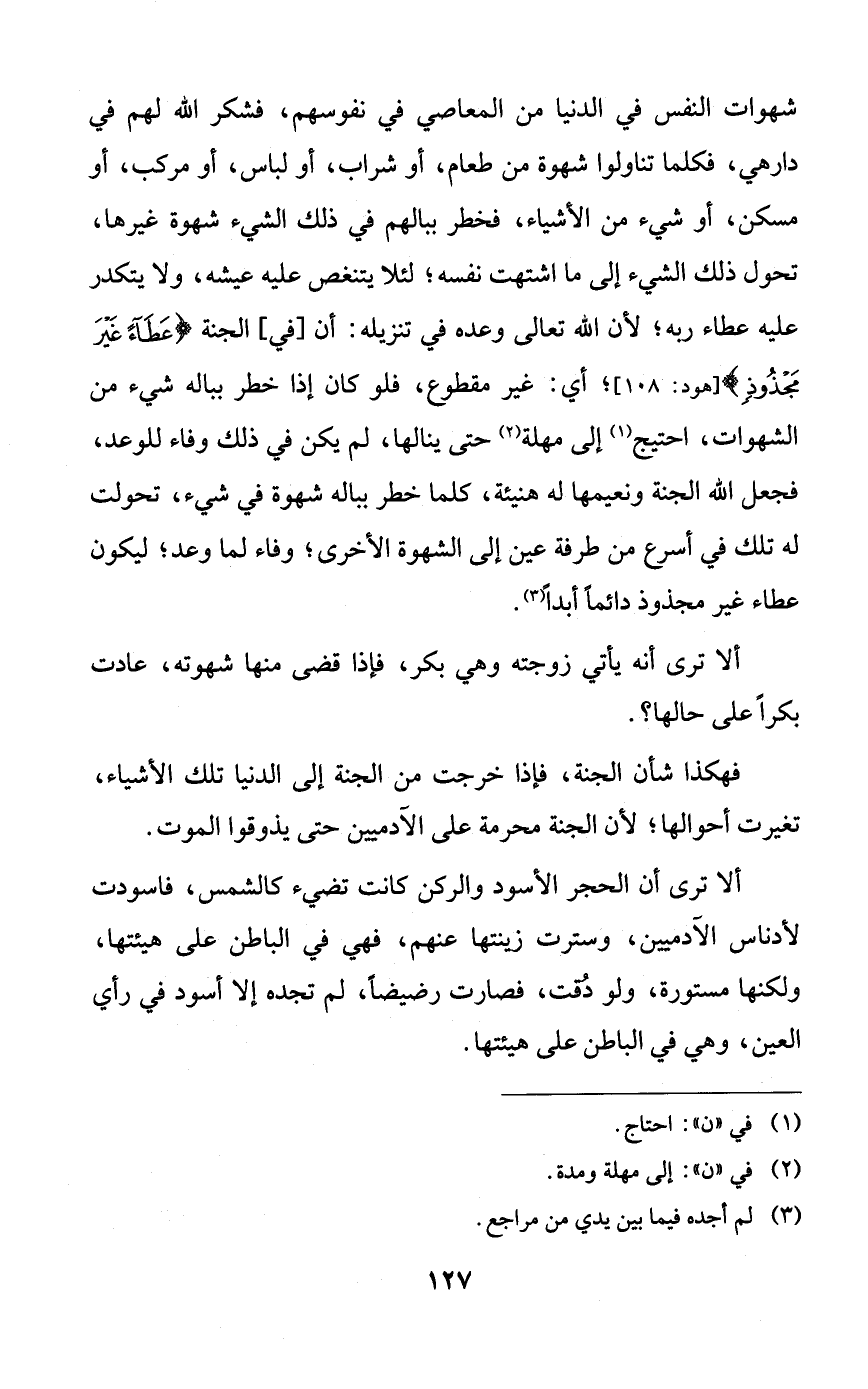 شهوات النفس في الدنيا من المعاصي في نفوسهم، فشكر الله لهم في دارهي، فكلما تناولوا شهوة من طعام، أو شراب، أو لباس، أو مركب، أو مسكن، أو شيء من الأشياء، فخطر ببالهم في ذلك الشيء شهوة غيرها، تحول ذلك الشيء إلى ما اشتهت نفسه؛ لئلا يتنغص عليه عيشه، ولا يتكدر عليه عطاء ربه؛ لأن الله تعالى وعده في تنزيله: أن [في] الجنة {عطاءً غير مجذوذٍ}؛ أي: غير مقطوع، فلو كان إذا خطر بباله شيء من الشهوات، احتيج إلى مهلة حتى ينالها، لم يكن في ذلك وفاء للوعد، فجعل الله الجنة ونعيمها له هنيئة، كلما خطر بباله شهوة في شيء، تحولت له تلك في أسرع من طرفة عين إلى الشهوة الأخرى؛ وفاء لما وعد؛ ليكون عطاء غير مجذوذ دائماً أبداً.