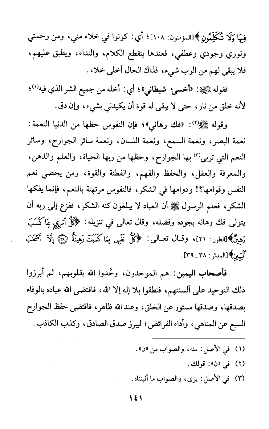 وقوله صلى الله عليه وسلم: ((فك رهاني))؛ فإن النفوس حظها من الدنيا النعمة: نعمة البصر، ونعمة السمع، ونعمة اللسان، ونعمة سائر الجوارح، وسائر النعم التي تربى بها الجوارح، وحظها من ربها الحياة، والعلم والذهن، والمعرفة والعقل، والحفظ والفهم، والفطنة والقوة، ومن يحصي نعم النفس وقوامها؟! ودوامها في الشكر، فالنفوس مرتهنة بالنعم، فإنما يفكها الشكر، فعلم الرسول صلى الله عليه وسلم أن العباد لا يبلغون كنه الشكر، ففزع إلى ربه أن يتولى فك رهانه بجوده وفضله، وقال تعالى في تنزيله: {كل امرئٍ بما كسب رهينٌ}، وقال تعالى: {كل نفسٍ بما كسبت رهينةٌ. إلا أصحاب اليمين}.