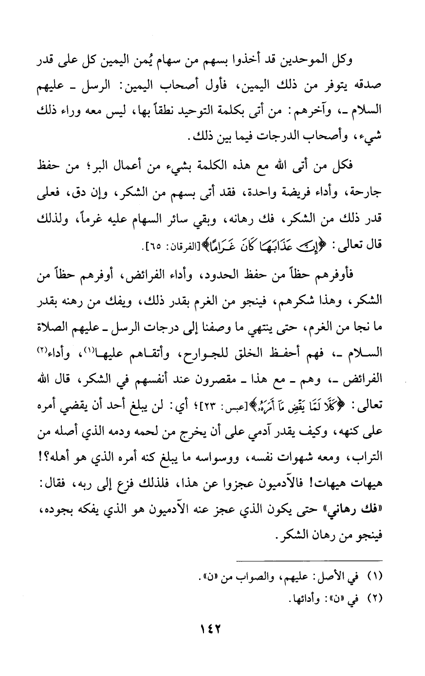 فكل من أتى الله مع هذه الكلمة بشيء من أعمال البر؛ من حفظ جارحة، وأداء فريضة واحدة، فقد أتى بسهم من الشكر، وإن دق، فعلى قدر ذلك من الشكر، فك رهانه، وبقي سائر السهام عليه غرماً، ولذلك قال تعالى: {إن عذابها كان غراماً}.