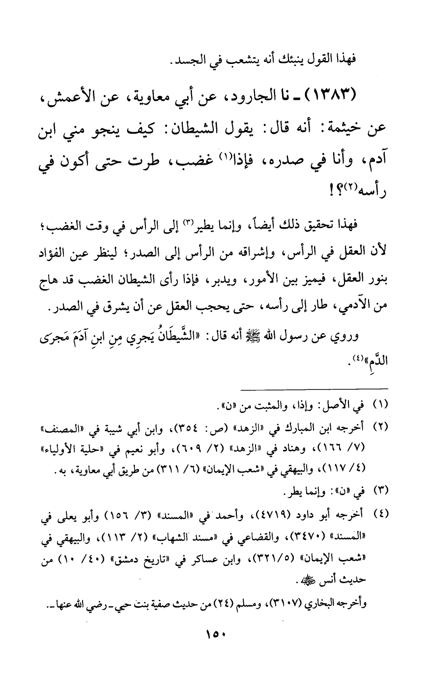 1383 - نا الجارود، عن أبي معاوية، عن الأعمش، عن خيثمة: أنه قال: يقول الشيطان: كيف ينجو مني ابن آدم، وأنا في صدره، فإذا غضب طرت حتى أكون في رأسه؟!