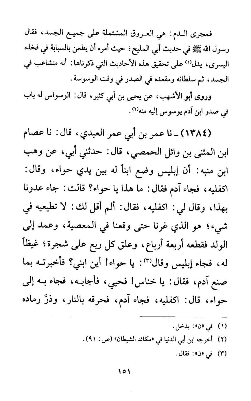 1384 - نا عمر بن أبي عمر العبدي، قال: نا عصام ابن المثنى بن وائل الحمصي، قال: حدثني أبي، عن وهب ابن منبه: أن إبليس وضع ابناً له بين يدي حواء، وقال: اكفليه، فجاء آدم فقال: ما هذا يا حواء؟ قالت: جاء عدونا بهذا، وقال لي: اكفليه، فقال: ألم أقل لك: لا تطيعيه في شيء؛ هو الذي غرنا حتى وقعنا في المعصية، وعمد إلى الولد فقطعه أربعة أرباع، وعلق كل ربع على شجرة؛ غيظاً له، فجاء إبليس وقال: يا حواء! أين ابني؟ فأخبرته بما صنع آدم، فقال: يا خناس! فحيي، فأجابه، فجاء به إلى حواء، قال اكفليه، فجاء آدم، فحرقه بالنار، وذر رماده