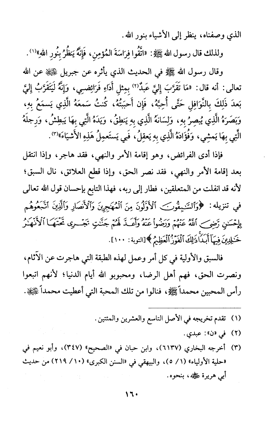 وقال رسول الله صلى الله عليه وسلم في الحديث الذي يأثره عن جبريل عليه السلام عن الله تعالى: أنه قال: ((ما تقرب إلي عبدٌ بمثل أداء فرائضي، وإنه ليتقرب إلي بعد ذلك بالنوافل حتى أحبه، فإن أحببته، كنت سمعه الذي يسمع به، وبصره الذي يبصر به، ولسانه الذي به ينطق، ويده التي بها يبطش، ورجله التي بها يمشي، وفؤاده الذي به يعقل، فبي يستعمل هذه الأشياء)).
