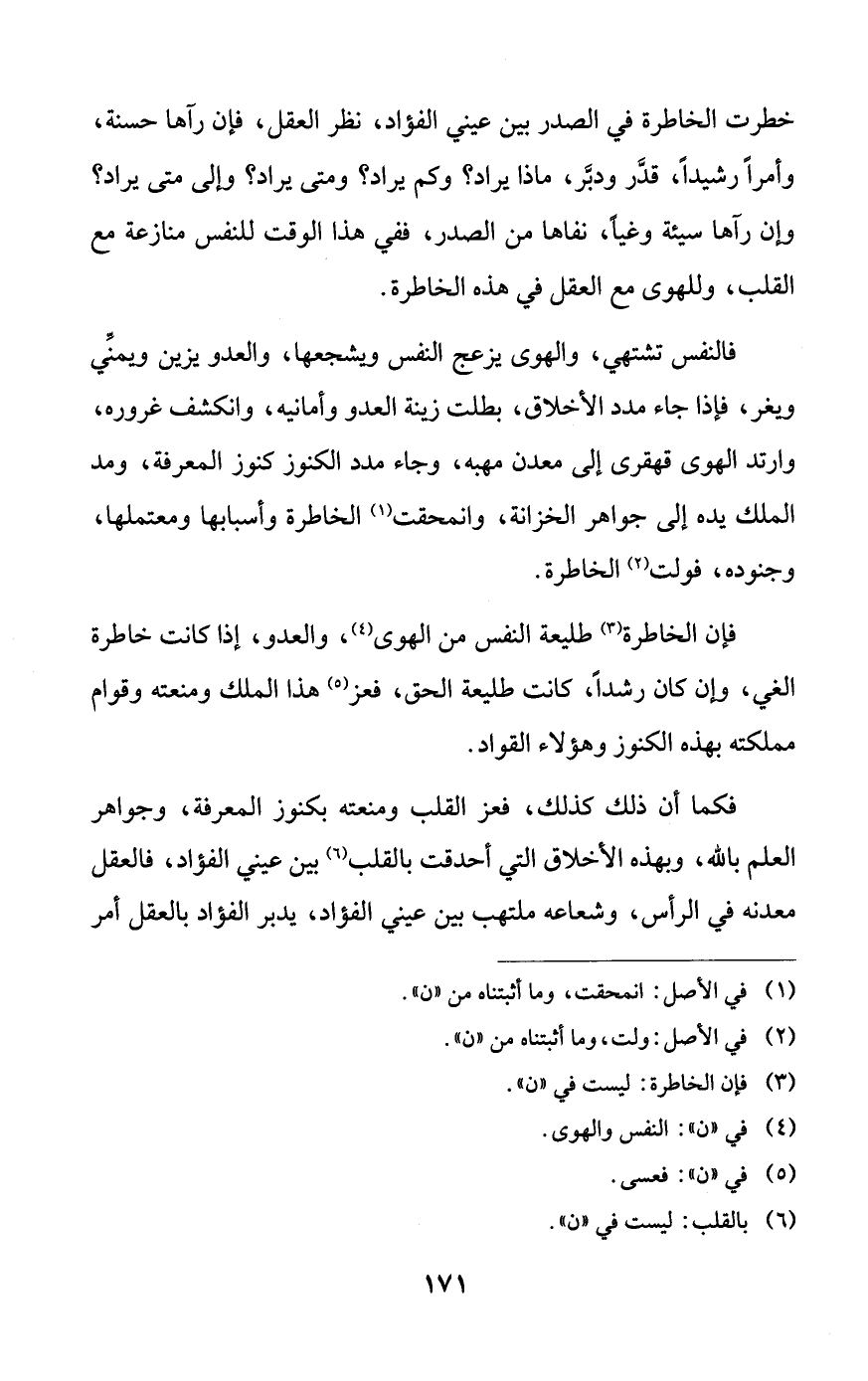 خطرت الخاطرة في الصدر بين عيني الفؤاد، نظر العقل، فإن رآها حسنة، وأمراً رشيداً، قدر ودبر، ماذا يراد؟ وكم يراد؟ ومتى يراد؟ وإلى متى يراد؟ وإن رآها سيئة وغياً، نفاها من الصدر، ففي هذا الوقت للنفس منازعة مع القلب، وللهوى مع العقل في هذه الخاطرة.