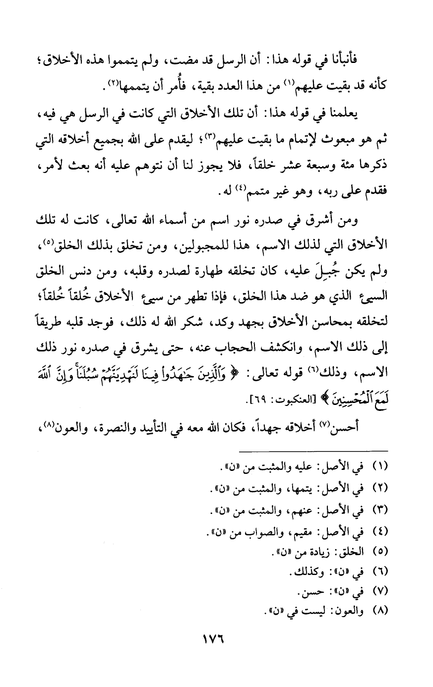 ومن أشرق في صدره نور اسم من أسماء الله تعالى، كانت له تلك الأخلاق التي لذلك الاسم، هذا للمجبولين، ومن تخلق بذلك الخلق، ولم يكن جبل عليه، كان تخلقه طهارة لصدره وقلبه، ومن دنس الخلق السيئ الذي هو ضد هذا الخلق، فإذا تطهر من سيئ الأخلاق خلقاً خلقاً؛ لتخلقه بمحاسن الأخلاق بجهد وكد، شكر الله له ذلك، فوجد قلبه طريقاً إلى ذلك الاسم، وانكشف الحجاب عنه، حتى يشرق في صدره نور ذلك الاسم، وذلك قوله تعالى: {والذين جاهدوا فينا لنهدينهم سبلنا وإن الله لمع المحسنين}.