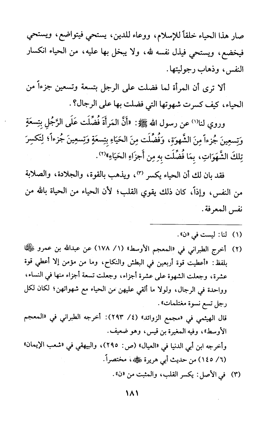 وروي لنا عن رسول الله صلى الله عليه وسلم: ((أن المرأة فضلت على الرجل بتسعةٍ وتسعين جزءاً من الشهوة، وفضلت من الحياء بتسعةٍ وتسعين جزءاً؛ لتكسر تلك الشهوات، بما فضلت به من أجزاء الحياء)).