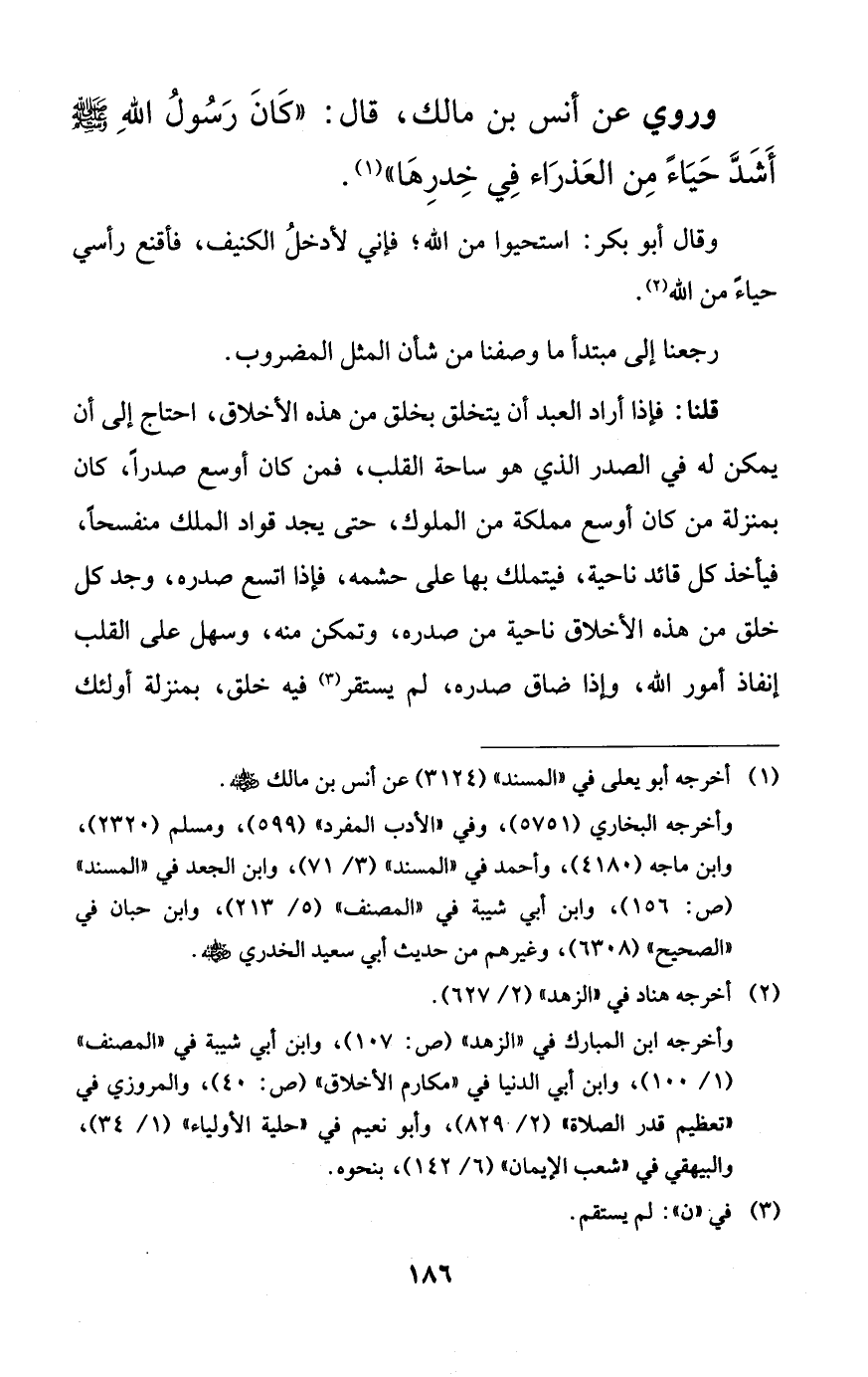 وروي عن أنس بن مالك، قال: ((كان رسول الله صلى الله عليه وسلم أشد حياءً من العذراء في خدرها)).