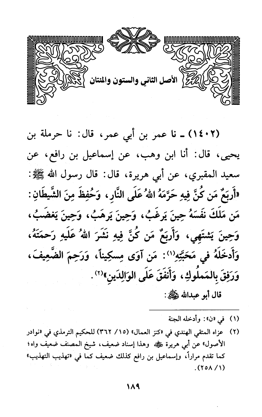 1402 - نا عمر بن أبي عمر، قال: نا حرملة بن يحيى، قال: أنا ابن وهب، عن إسماعيل بن رافع، عن سعيد المقبري، عن أبي هريرة، قال: قال رسول الله صلى الله عليه وسلم: ((أربعٌ من كن فيه حرمه الله على النار، وحفظ من الشيطان: من ملك نفسه حين يرغب، وحين يرهب، وحين يغضب، وحين يشتهي، وأربعٌ من كن فيه نشر الله عليه رحمته، وأدخله في محبته: من آوى مسكيناً، ورحم الضعيف، ورفق بالمملوك، وأنفق على الوالدين)).