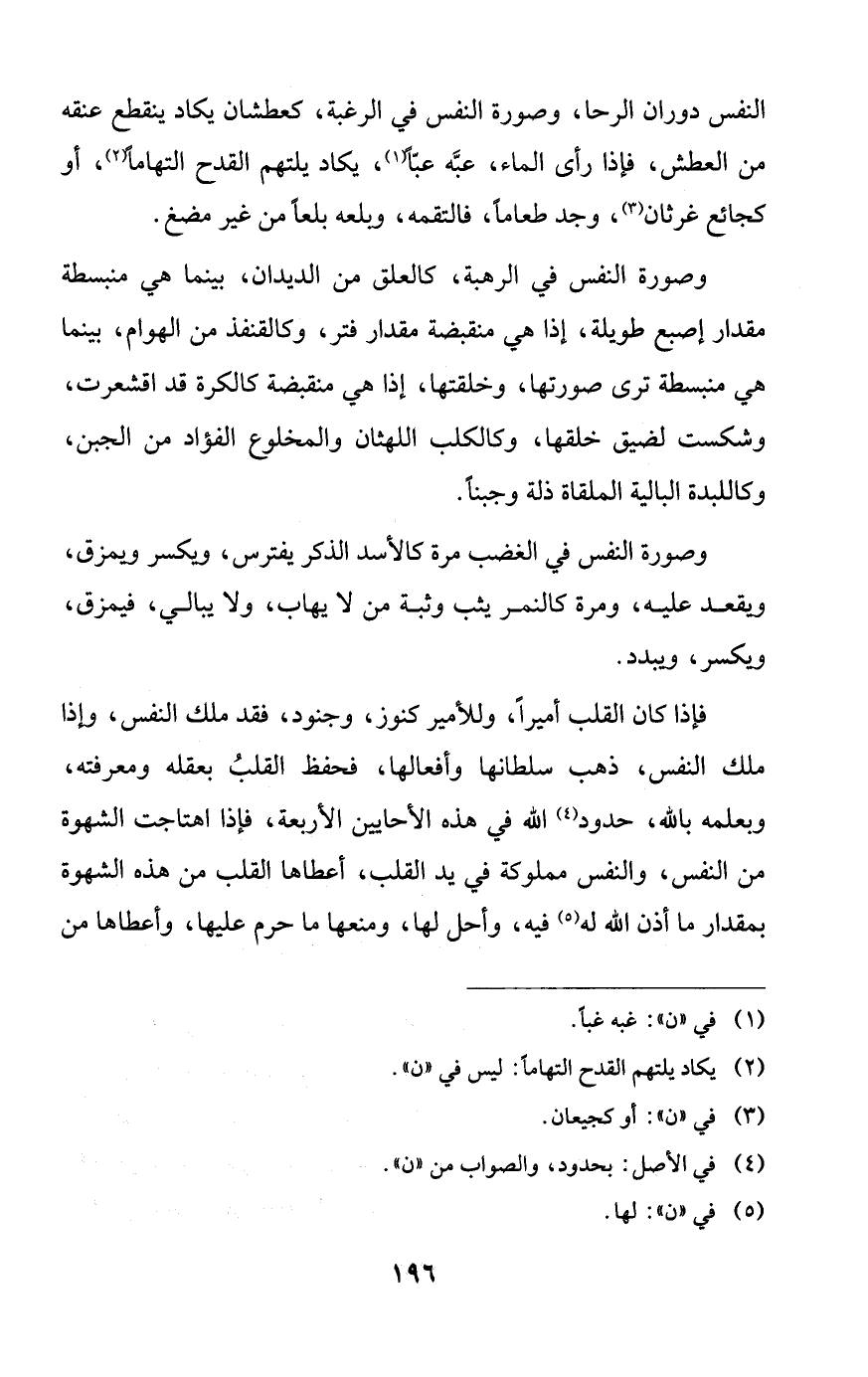 النفس دوران الرحا، وصورة النفس في الرغبة، كعطشان يكاد ينقطع عنقه من العطش، فإذا رأى الماء، عبه عباً، يكاد يلتهم القدح التهاماً، أو كجائع غرثان، وجد طعاماً، فالتقمه، وبلعه بلعاً من غير مضغ.