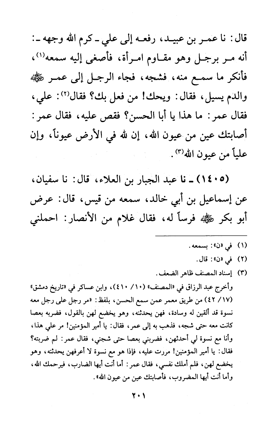 قال: نا عمر بن عبيد، رفعه إلى علي -كرم الله وجهه-: أنه مر برجل وهو مقاوم امرأة، فأصغى إليه سمعه، فأنكر ما سمع منه، فشجه، فجاء الرجل إلى عمر رضي الله عنه والدم يسيل، فقال: ويحك! من فعل بك؟ فقال: علي، فقال عمر: ما هذا يا أبا الحسن؟ فقص عليه، فقال عمر: أصابتك عين من عيون الله، إن لله في الأرض عيوناً، وإن علياً من عيون الله.