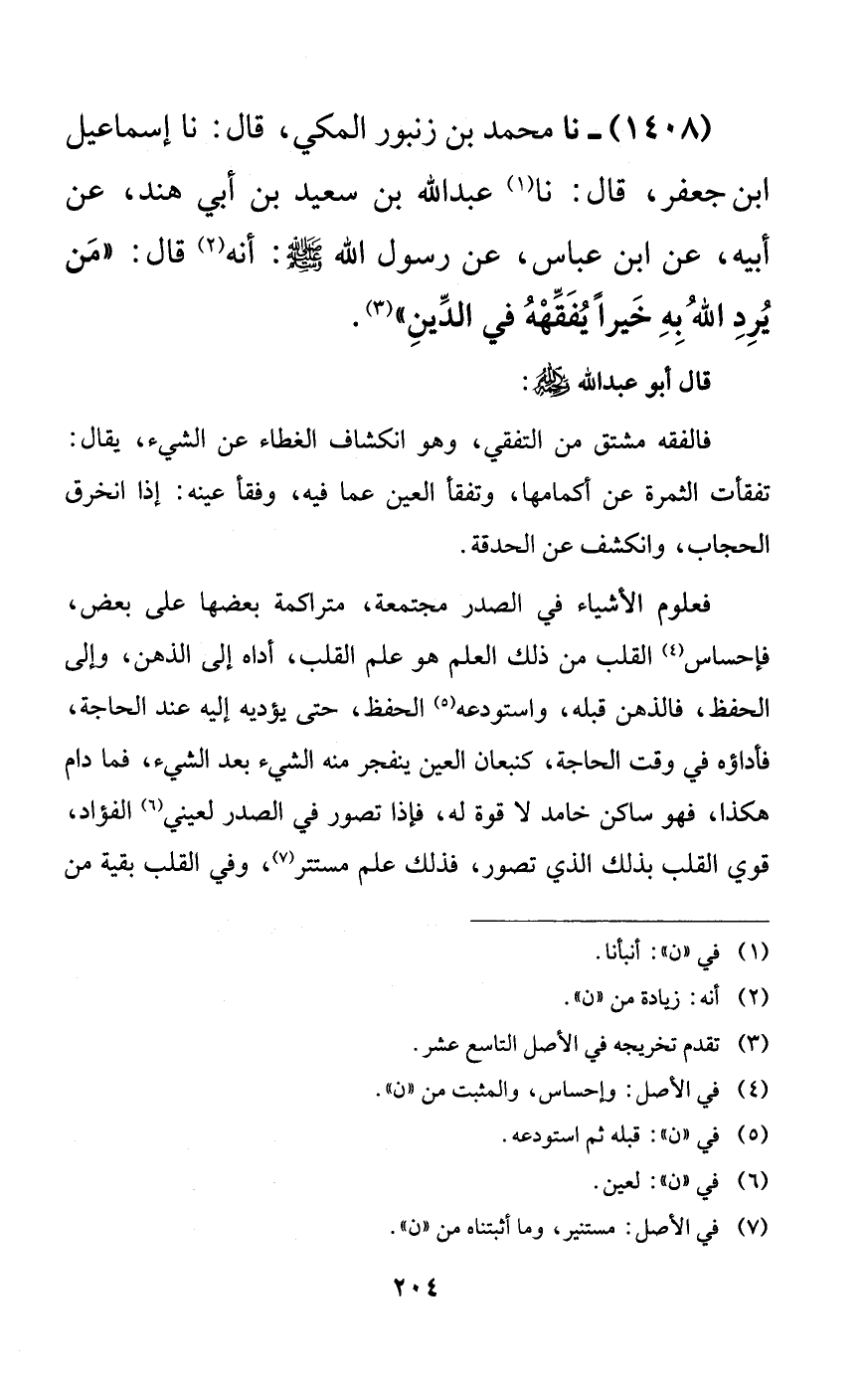 1408 - نا محمد بن زنبور المكي، قال: نا إسماعيل ابن جعفر، قال: نا عبد الله بن سعيد بن أبي هند، عن أبيه، عن ابن عباس، عن رسول الله صلى الله عليه وسلم: أنه قال: ((من يرد الله به خيراً يفقهه في الدين)).
