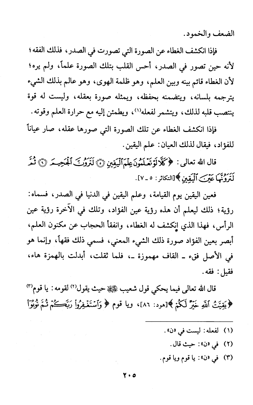 فعين اليقين يوم القيامة، وعلم اليقين في الدنيا في الصدر، فسماه: رؤية؛ ذلك ليعلم أن هذه رؤية عين الفؤاد، وتلك في الآخرة رؤية عين الرأس، فهذا الذي انكشف له الغطاء، وانفقأ الحجاب عن مكنون العلم، أبصر بعين الفؤاد صورة ذلك الشيء المعني، فسمي ذلك فقهاً، وإنما هو في الأصل فقء -القاف مهموزة-، فلما ثقلت، أبدلت بالهمزة هاء، فقيل: فقه.