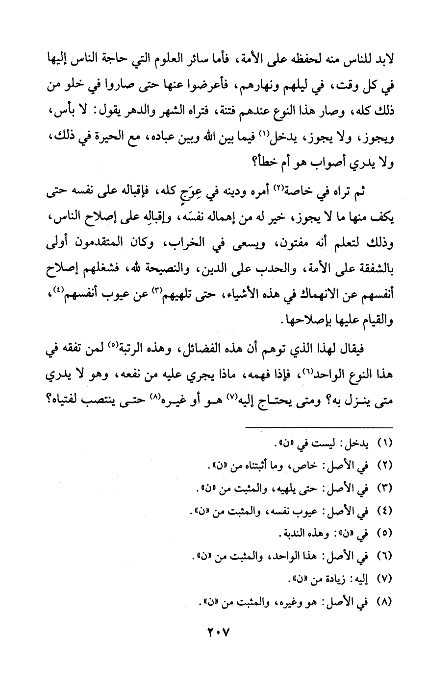 لابد للناس منه لحفظه على الأمة، فأما سائر العلوم التي حاجة الناس إليها في كل وقت، في ليلهم ونهارهم، فأعرضوا عنها حتى صاروا في خلو من ذلك كله، وصار هذا النوم عندهم فتنة، فتراه الشهر والدهر يقول: لا بأس، ويجوز، ولا يجوز، يدخل فيما بين الله وبين عباده، مع الحيرة في ذلك، ولا يدري أصواب هو أم خطأ؟