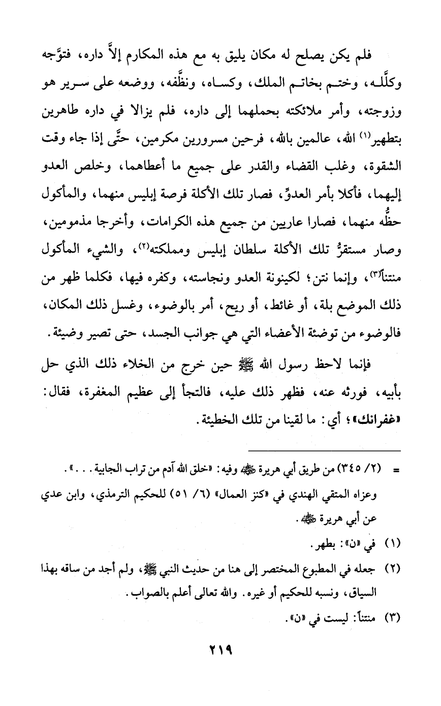 فلم يكن يصلح له مكان يليق به مع هذه المكارم إلا داره، فتوجه وكلله، وختم بخاتم الملك، وكساه، ونظفه، ووضعه على سرير هو وزوجته، وأمر ملائكته بحملهما إلى داره، فلم يزالا في داره طاهرين بتطهير الله، عالمين بالله، فرحين مسرورين مكرمين، حتى إذا جاء وقت الشقوة، وغلب القضاء والقدر على جميع ما أعطاهما، وخلص العدو إليهما، فأكلا بأمر العدو، فصار تلك الأكلة فرصة إبليس منهما، والمأكول حظه منهما، فصارا عاريين من جميع هذه الكرامات، وأخرجا مذمومين، وصار مستقر تلك الأكلة سلطان إبليس ومملكته، والشيء المأكول منتناً، وإنما نتن؛ لكينونة العدو ونجاسته، وكفره فيها، فكلما ظهر من ذلك الموضع بلة، أو غائط، أو ريح، أمر بالوضوء، وغسل ذلك المكان، فالوضوء من توضئة الأعضاء التي هي جوانب الجسد، حتى تصير وضيئة.