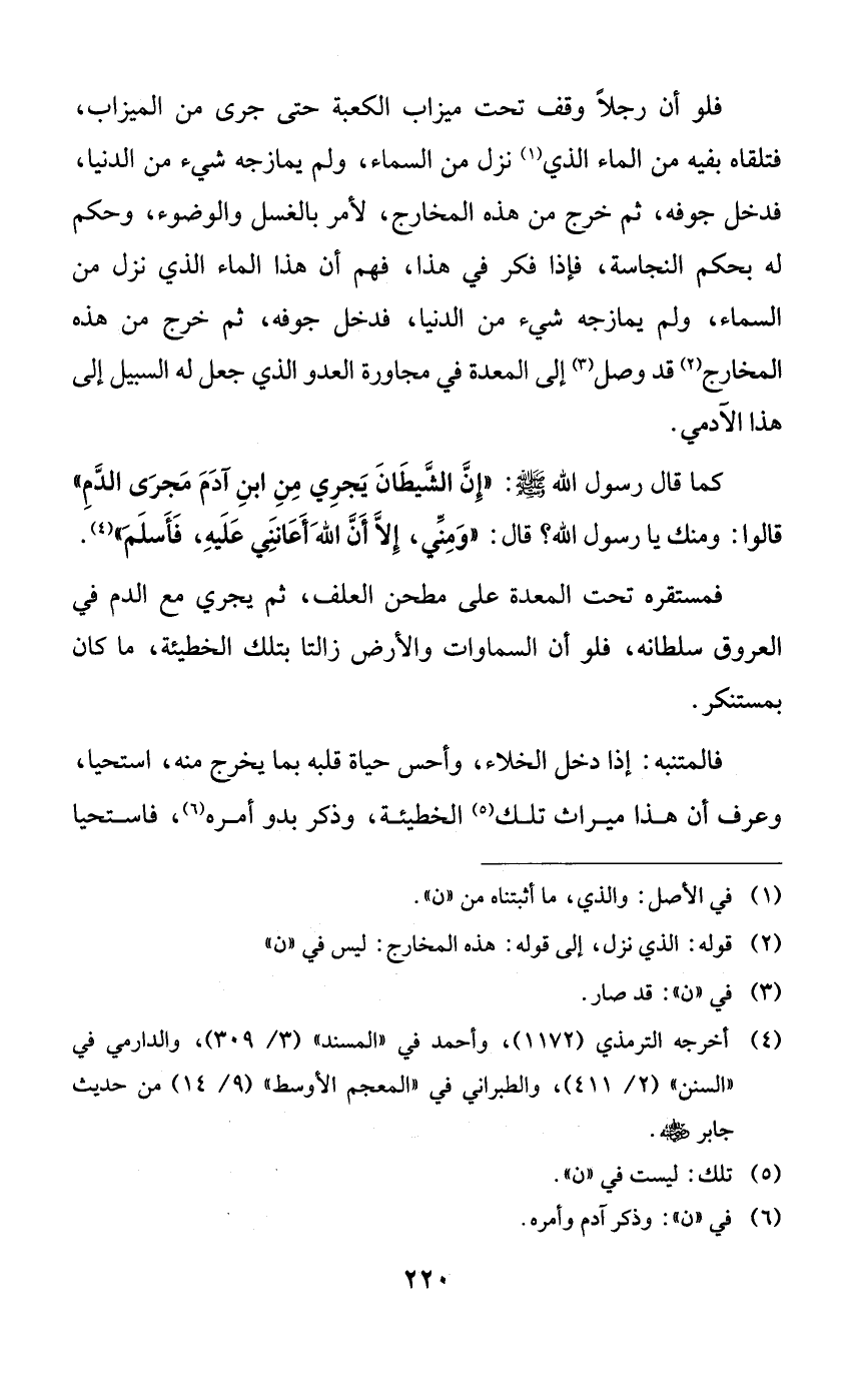 فلو أن رجلاً وقف تحت ميزاب الكعبة حتى جرى من الميزاب، فتلقاه بفيه من الماء الذي نزل من السماء، ولم يمازجه شيء من الدنيا، فدخل جوفه، ثم خرج من هذه المخارج، لأمر بالغسل والوضوء، وحكم له بحكم النجاسة، فإذا فكر في هذا، فهم أن هذا الماء الذي نزل من السماء، ولم يمازجه شيء من الدنيا، فدخل جوفه، ثم خرج من هذه المخارج قد وصل إلى المعدة في مجاورة العدو الذي جعل له السبيل إلى هذا الآدمي.