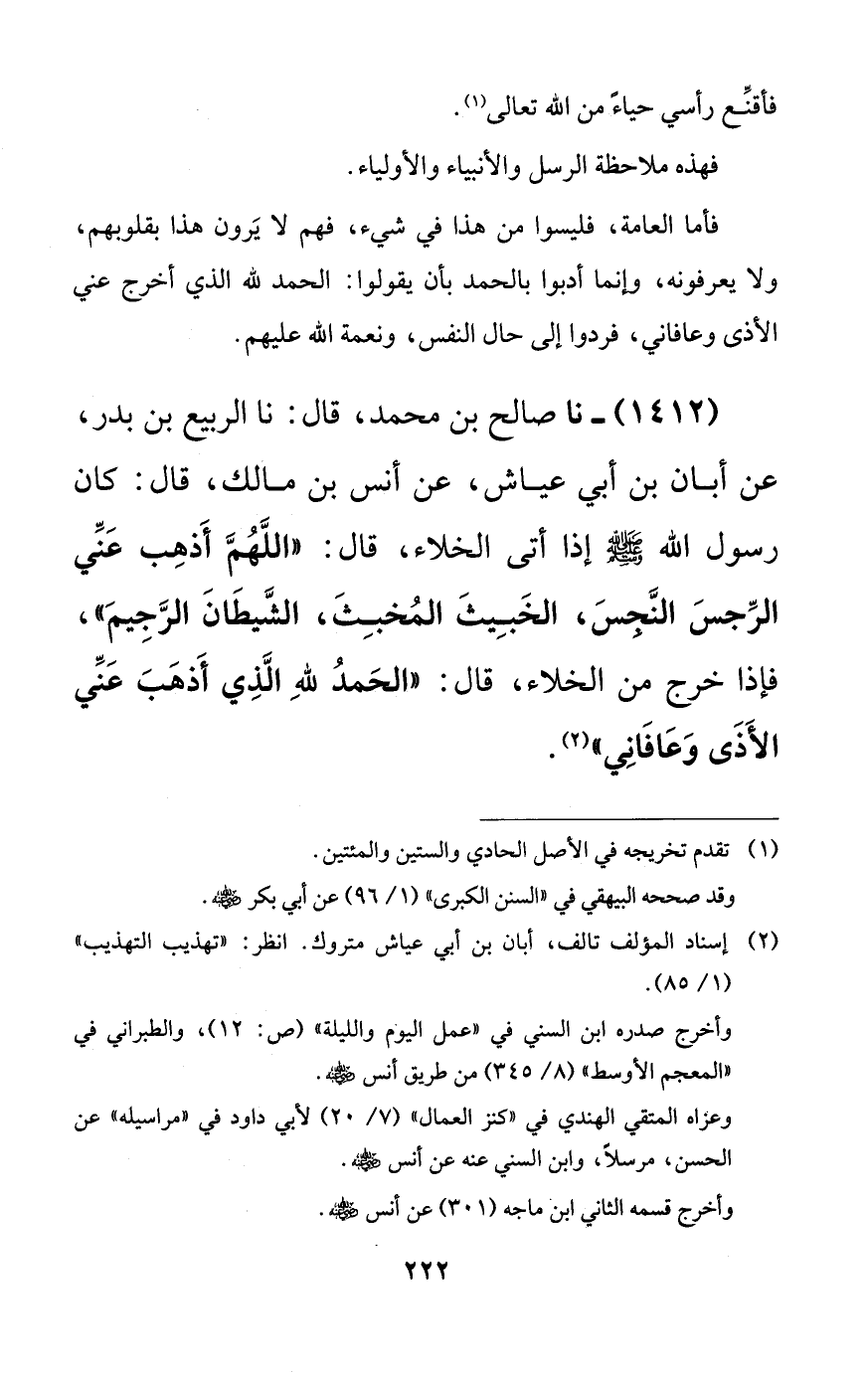 1412 - نا صالح بن محمد، قال: نا الربيع بن بدر، عن أبان بن أبي عياش، عن أنس بن مالك، قال: كان رسول الله صلى الله عليه وسلم إذا أتى الخلاء، قال: ((اللهم أذهب عني الرجس النجس، الخبيث المخبث، الشيطان الرجيم))، فإذا خرج من الخلاء، قال: ((الحمد لله الذي أذهب عني الأذى وعافاني)).