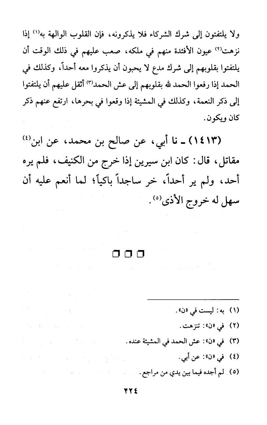 1413 - نا أبي، عن صالح بن محمد، عن ابن مقاتل، قال: كان ابن سيرين إذا خرج من الكنيف، فلم يره أحد، ولم ير أحداً، خر ساجداً باكياً؛ لما أنعم عليه أن سهل له خروج الأذى.