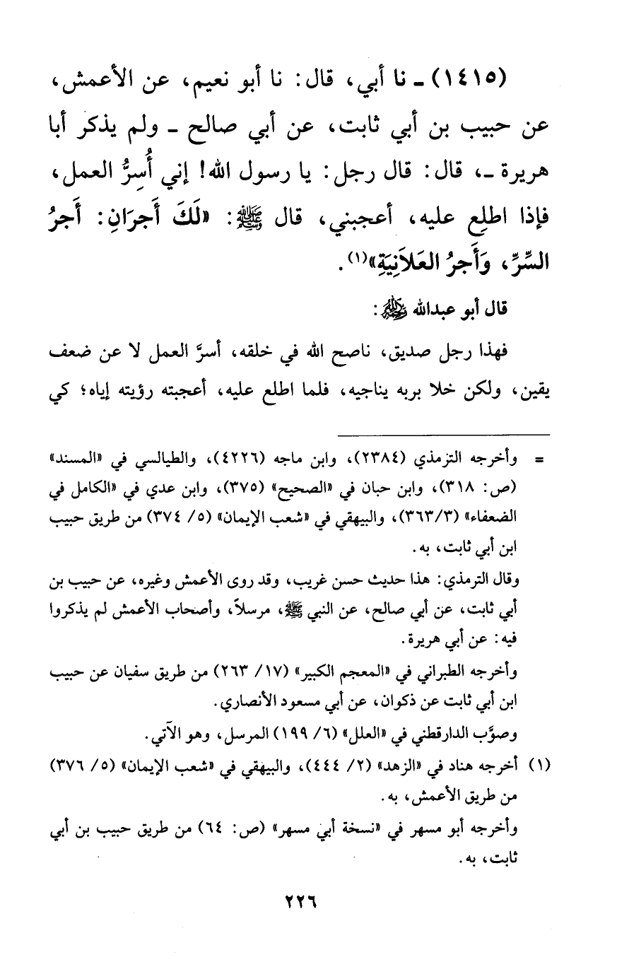 1415 - نا أبي، قال: نا أبو نعيم، عن الأعمش، عن حبيب بن أبي ثابت، عن أبي صالح -ولم يذكر أبا هريرة-، قال: قال رجل: يا رسول الله! إني أسر العمل، فإذا اطلع عليه، أعجبني، قال صلى الله عليه وسلم: ((لك أجران: أجر السر، وأجر العلانية)).
