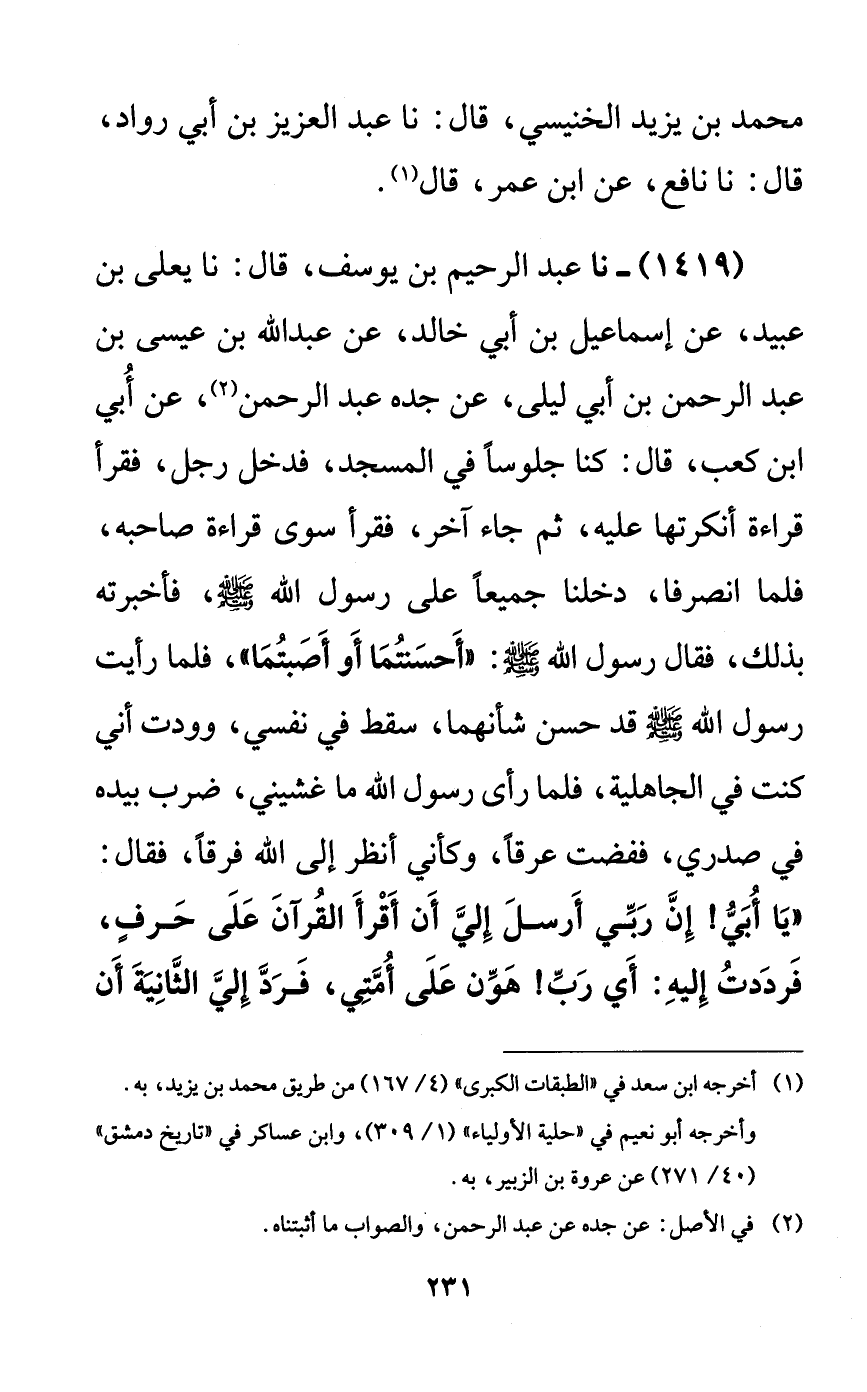 1419 - نا عبد الرحيم بن يوسف، قال: نا يعلى بن عبيد، عن إسماعيل بن أبي خالد، عن عبد الله بن عيسى بن عبد الرحمن بن أبي ليلى، عن جده عبد الرحمن، عن أبي ابن كعب، قال: كنا جلوساً في المسجد، فدخل رجل، فقرأ قراءة أنكرتها عليه، ثم جاء آخر، فقرأ سوى قراءة صاحبه، فلما انصرفا، دخلنا جميعاً على رسول الله صلى الله عليه وسلم، فأخبرته بذلك، فقال رسول الله صلى الله عليه وسلم: ((أحسنتما أو أصبتما))، فلما رأيت رسول الله صلى الله عليه وسلم قد حسن شأنهما، سقط في نفسي، وودت أني كنت في الجاهلية، فلما رأى رسول الله ما غشيني، ضرب بيده في صدري، ففضت عرقاً، وكأني أنظر إلى الله فرقاً، فقال: ((يا أبي! إن ربي أرسل إلي أن أقرأ القرآن على حرفٍ، فرددت إليه: أي رب! هون على أمتي، فرد إلي الثانية أن