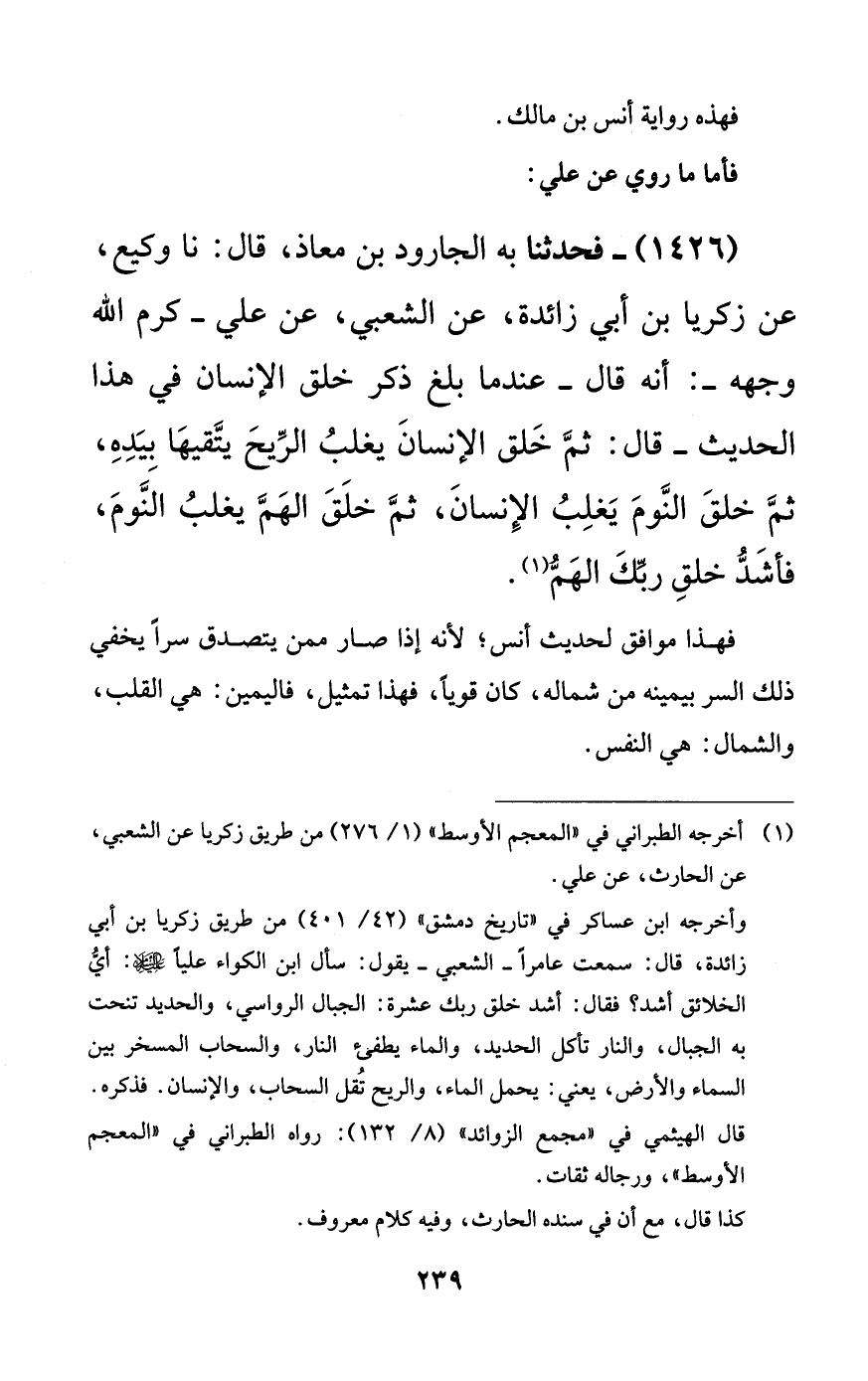 1426 - فحدثنا به الجارود بن معاذ، قال: نا وكيع، عن زكريا بن أبي زائدة، عن الشعبي، عن علي -كرم الله وجهه-: أنه قال -عندما بلغ ذكر خلق الإنسان في هذا الحديث- قال: ثم خلق الإنسان يغلب الريح يتقيها بيده، ثم خلق النوم يغلب الإنسان، ثم خلق الهم يغلب النوم، فأشد خلق ربك الهم)).