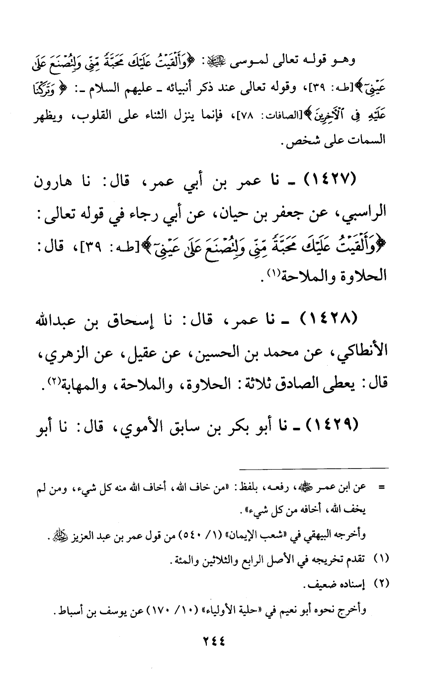1427 - نا عمر بن أبي عمر، قال: نا هارون الراسبي، عن جعفر بن حيان، عن أبي رجاء في قوله تعالى: {وألقيت عليك محبةً مني ولتصنع على عيني}، قال: الحلاوة والملاحة.