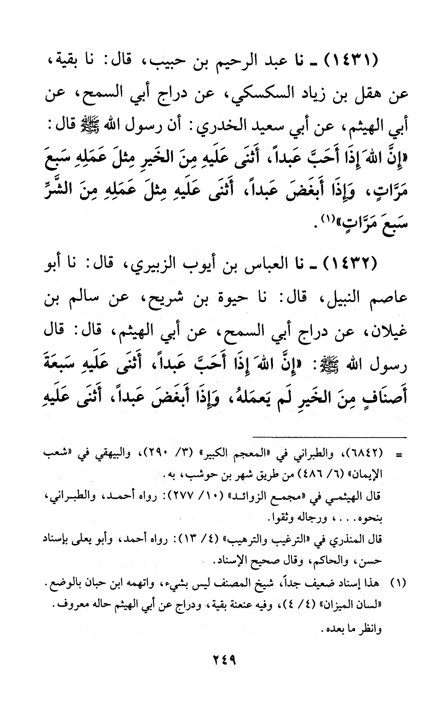 1431 - نا عبد الرحيم بن حبيب، قال: نا بقية، عن هقل بن زياد السكسكي، عن دراج أبي السمح، عن أبي الهيثم، عن أبي سعيد الخدري: أن رسول الله صلى الله عليه وسلم قال: ((إن الله إذا أحب عبداً، أثنى عليه من الخير مثل عمله سبع مراتٍ، وإذا أبغض عبداً، أثنى عليه مثل عمله من الشر سبع مراتٍ)).