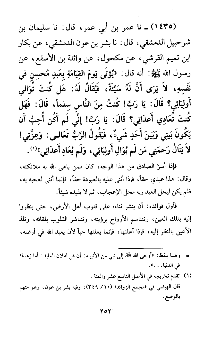 1435 - نا عمر بن أبي عمر، قال: نا سليمان بن شرحبيل الدمشقي، قال: نا بشر بن عون الدمشقي، عن بكار ابن تميم القرشي، عن مكحول، عن واثلة بن الأسقع، عن رسول الله صلى الله عليه وسلم: أنه قال: ((يؤتى يوم القيامة بعبدٍ محسنٍ في نفسه، لا يرى أن له سيئةً، فيقال له: هل كنت توالي أوليائي؟ قال: يا رب! كنت من الناس سلماً، قال: فهل كنت تعادي أعدائي؟ قال: يا رب! إني لم أكن أحب أن يكون بيني وبين أحدٍ شيءٌ، فيقول الرب تعالى: وعزتي! لا ينال رحمتي من لم يوال أوليائي، ولم يعاد أعدائي)).