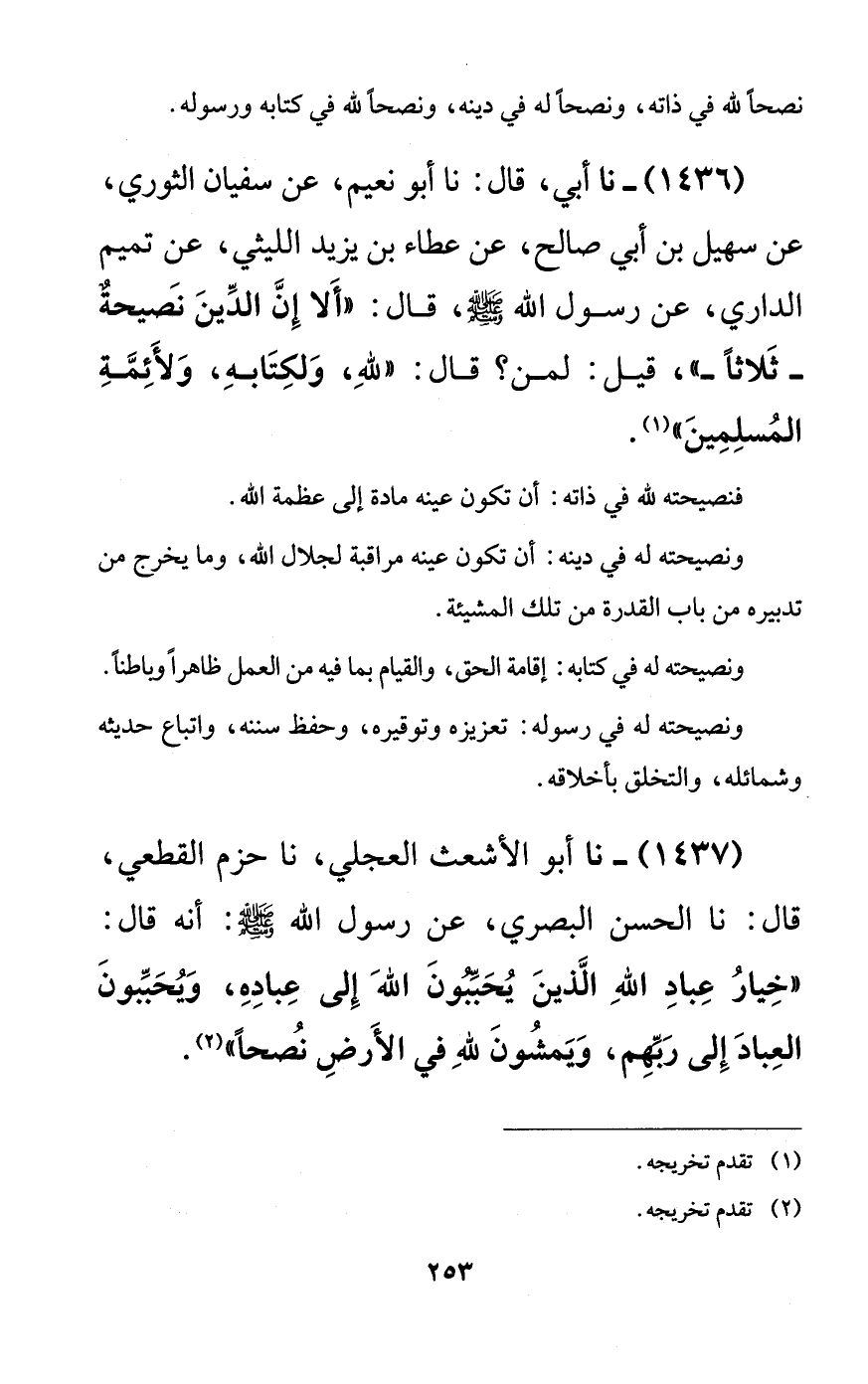 1436 - نا أبي، قال: نا أبو نعيم، عن سفيان الثوري، عن سهيل بن أبي صالح، عن عطاء بن يزيد الليثي، عن تميم الداري، عن رسول الله صلى الله عليه وسلم، قال: ((ألا إن الدين نصيحةٌ -ثلاثاً-))، قيل: لمن؟ قال: ((لله، ولكتابه، ولأئمة المسلمين)).