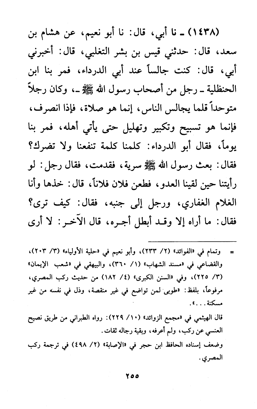 1438 - نا أبي، قال: نا أبو نعيم، عن هشام بن سعد، قال: حدثني قيس بن بشر التغلبي، قال: أخبرني أبي، قال: كنت جالساً عند أبي الدرداء، فمر بنا ابن الحنظلية -رجل من أصحاب رسول الله صلى الله عليه وسلم-، وكان رجلاً متوحداً قلما يجالس الناس، إنما هو صلاة، فإذا انصرف، فإنما هو تسبيح وتكبير وتهليل حتى يأتي أهله، فمر بنا يوماً، فقال أبو الدرداء: كلمنا كلمة تنفعنا ولا تضرك؟ فقال: بعث رسول الله صلى الله عليه وسلم سرية، فقدمت، فقال رجل: لو رأيتنا حين لقينا العدو، فطعن فلان فلاناً، قال: خذها وأنا الغلام الغفاري، ورجل إلى جنبه، فقال: كيف ترى؟ فقال: ما أراه إلا وقد أبطل أجره، قال الآخر: لا أرى