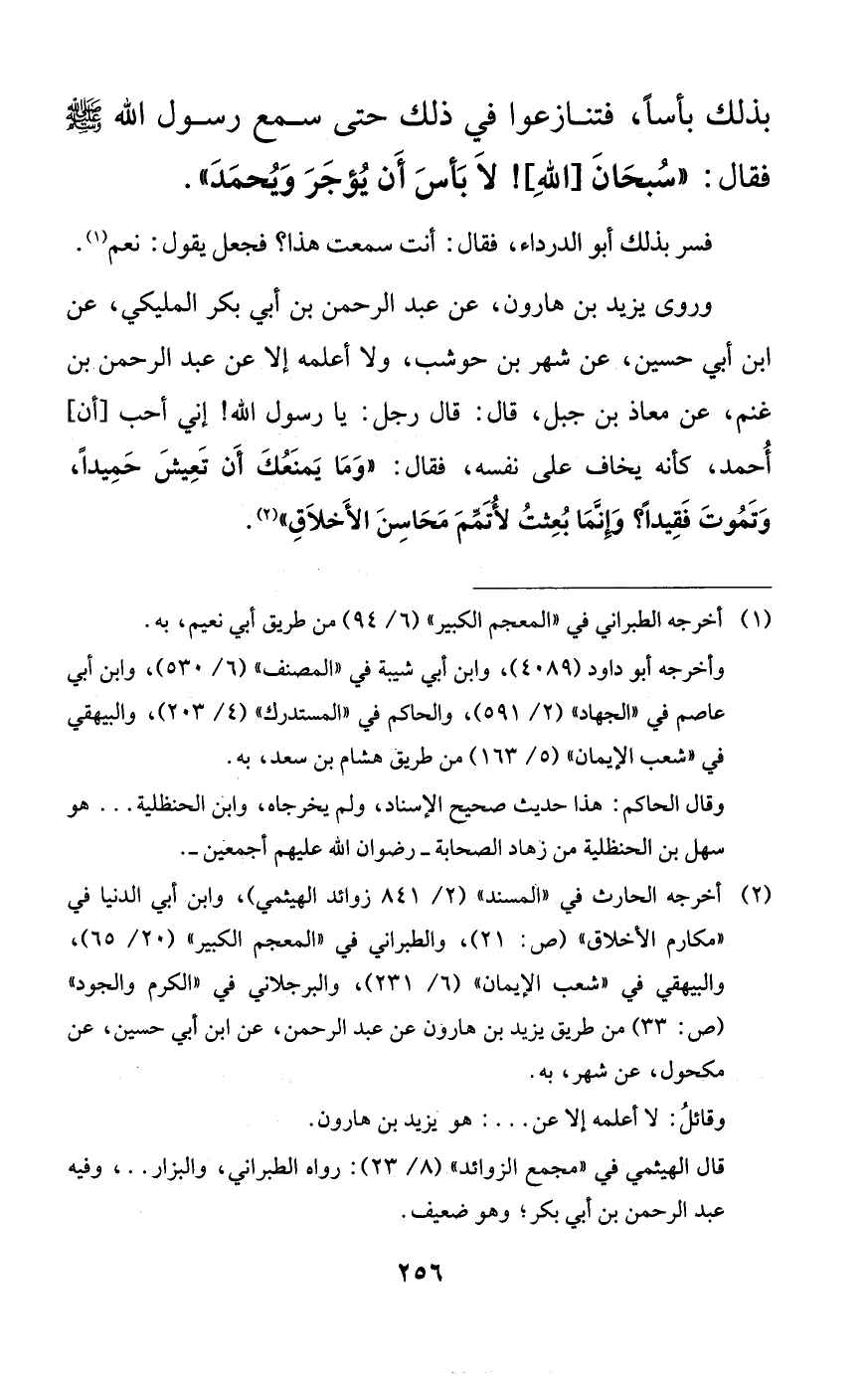 وروى يزيد بن هارون، عن عبد الرحمن بن أبي بكر المليكي، عن ابن أبي حسين، عن شهر بن حوشب، ولا أعلمه إلا عن عبد الرحمن بن غنم، عن معاذ بن جبل، قال: قال رجل: يا رسول الله! إني أحب [أن] أحمد، كأنه يخاف على نفسه، فقال: ((وما يمنعك أن تعيش حميداً، وتموت فقيداً؟ وإنما بعثت لأتمم محاسن الأخلاق)).