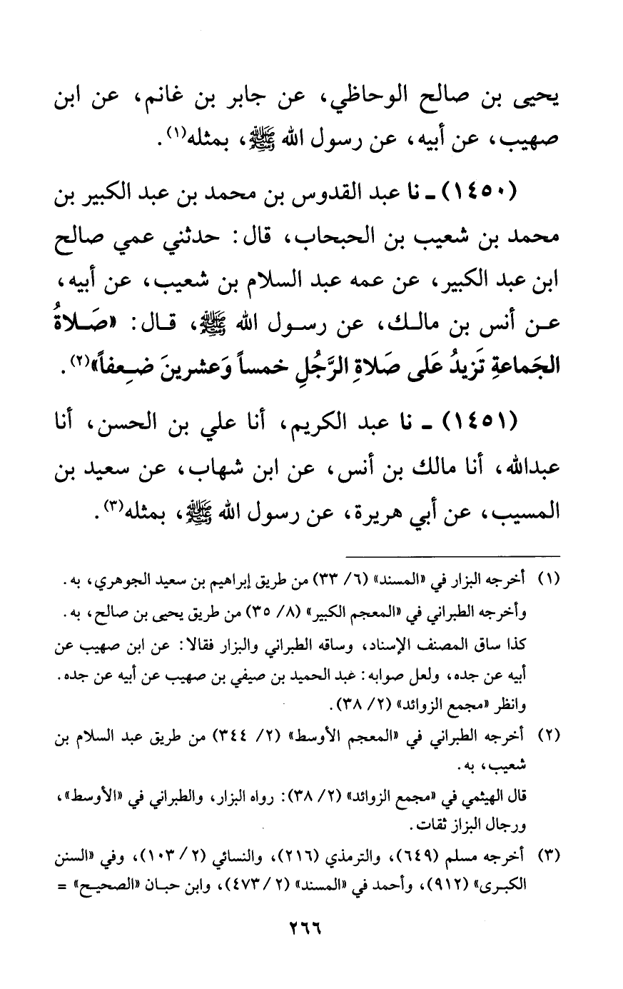 1450 - نا عبد القدوس بن محمد بن عبد الكبير بن محمد بن شعيب بن الحبحاب، قال: حدثني عمي صالح ابن عبد الكبير، عن عمه عبد السلام بن شعيب، عن أبيه، عن أنس بن مالك، عن رسول الله صلى الله عليه وسلم، قال: ((صلاة الجماعة تزيد على صلاة الرجل خمساً وعشرين ضعفاً)).