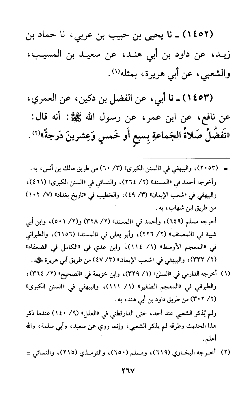 1453 - نا أبي، عن الفضل بن دكين، عن العمري، عن نافع، عن ابن عمر، عن رسول الله صلى الله عليه وسلم: أنه قال: ((تفضل صلاة الجماعة بسبعٍ أو خمسٍ وعشرين درجةً)).