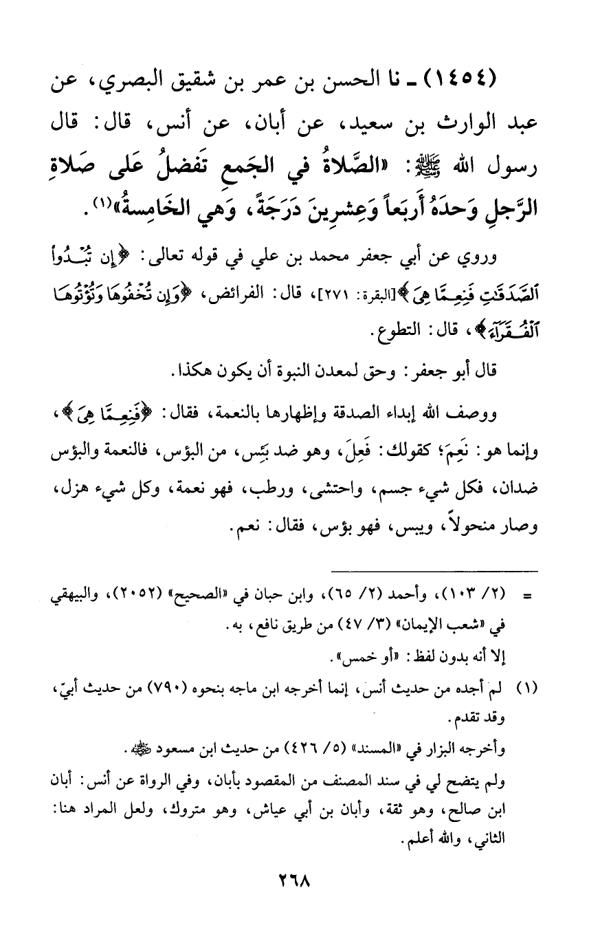 1454 - نا الحسن بن عمر بن شقيق البصري، عن عبد الوارث بن سعيد، عن أبان، عن أنس، قال: قال رسول الله صلى الله عليه وسلم: ((الصلاة في الجمع تفضل على صلاة الرجل وحده أربعاً وعشرين درجةً، وهي الخامسة)).
