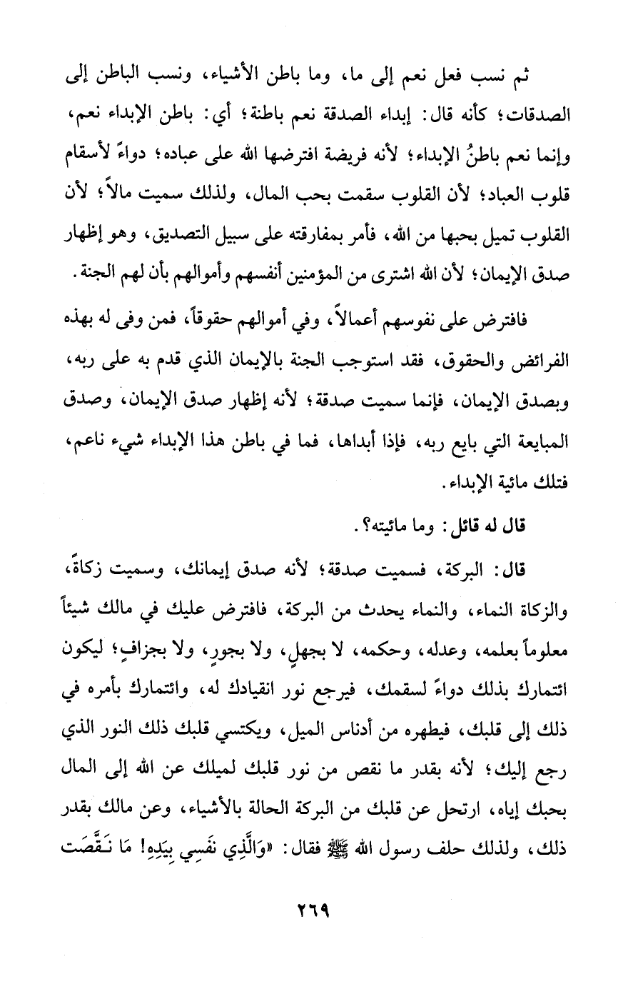 قال: البركة، فسميت صدقة؛ لأنه صدق إيمانك، وسميت زكاةً، والزكاة النماء، والنماء يحدث من البركة، فافترض عليك في مالك شيئاً معلوماً بعلمه، وعدله، وحكمه، لا بجهلٍ، ولا بجورٍ، ولا بجزافٍ؛ ليكون ائتمارك بذلك دواءً لسقمك، فيرجع نور انقيادك له، وائتمارك بأمره في ذلك إلى قلبك، فيطهره من أدناس الميل، ويكتسي قلبك ذلك النور الذي رجع إليك؛ لأنه بقدر ما نقص من نور قلبك لميلك عن الله إلى المال بحبك إياه، ارتحل عن قلبك من البركة الحالة بالأشياء، وعن مالك بقدر ذلك، ولذلك حلف رسول الله صلى الله عليه وسلم فقال: ((والذي نفسي بيده! ما نقصت