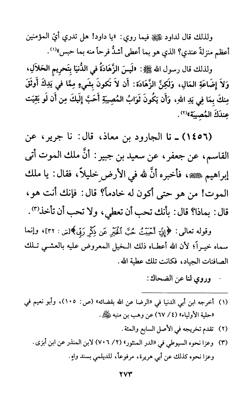 1456 - نا الجارود بن معاذ، قال: نا جرير، عن القاسم، عن جعفر، عن سعيد بن جبير: أن ملك الموت أتى إبراهيم عليهما السلام، فأخبره أن لله في الأرض خليلاً، فقال: يا ملك الموت! من هو حتى أكون له خادماً؟ قال: فإنك أنت هو، قال: بماذا؟ قال: بأنك تحب أن تعطي، ولا تحب أن تأخذ.