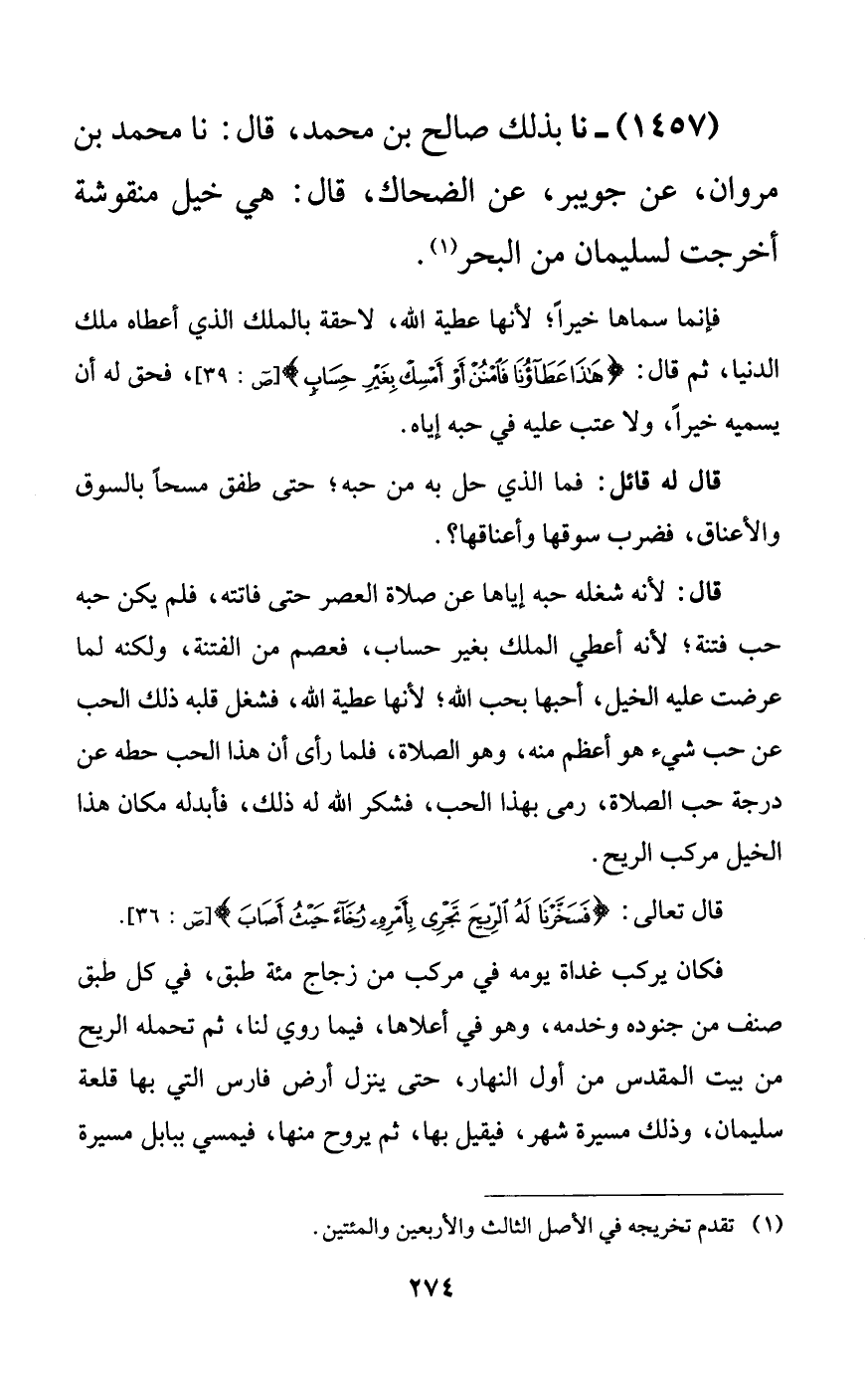 1457 - نا بذلك صالح بن محمد، قال: نا محمد بن مروان، عن جويبر، عن الضحاك، قال: هي خيل منقوشة أخرجت لسليمان من البحر.