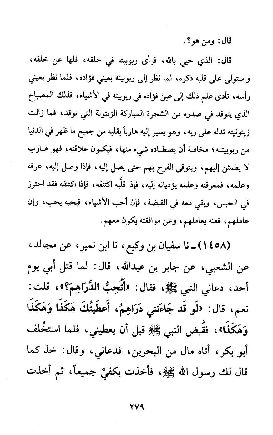 1458 - نا سفيان بن وكيع، نا ابن نمير، عن مجالد، عن الشعبي، عن جابر بن عبد الله، قال: لما قتل أبي يوم أحد، دعاني النبي صلى الله عليه وسلم، فقال: ((أتحب الدراهم؟))، قلت: نعم، قال: ((لو قد جاءتني دراهم، أعطيتك هكذا وهكذا وهكذا))، فقبض النبي صلى الله عليه وسلم قبل أن يعطيني، فلما استخلف أبو بكر، أتاه مال من البحرين، فدعاني، وقال: خذ كما قال لك رسول الله صلى الله عليه وسلم، فأخذت بكفي جميعاً، ثم أخذت