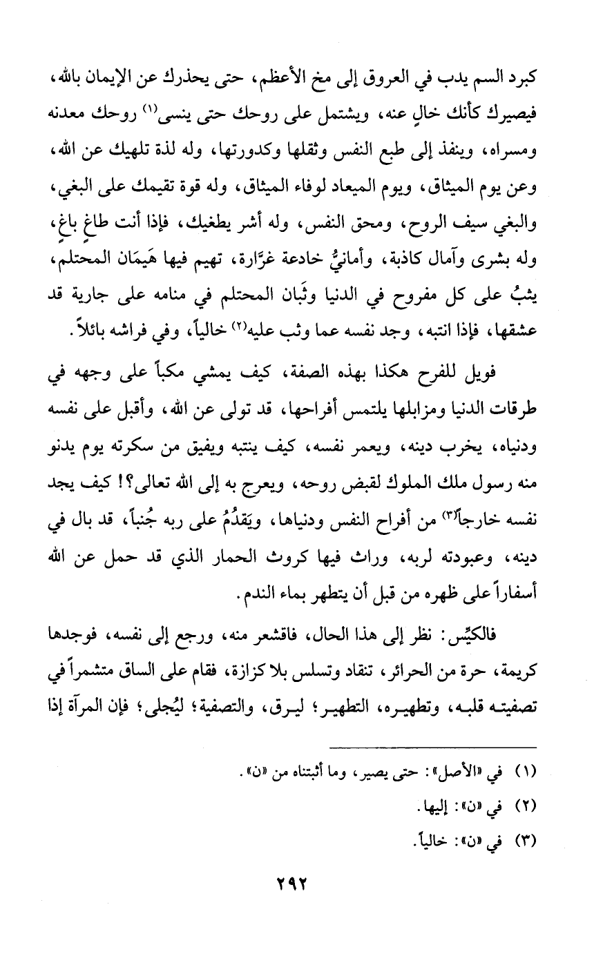 كبرد السم يدب في العروق إلى مخ الأعظم، حتى يحذرك عن الإيمان بالله، فيصيرك كأنك خالٍ عنه، ويشتمل على روحك حتى ينسى روحك معدنه ومسراه، وينفذ إلى طبع النفس وثقلها وكدورتها، وله لذة تلهيك عن الله، وعن يوم الميثاق، ويوم الميعاد لوفاء الميثاق، وله قوة تقيمك على البغي، والبغي سيف الروح، ومحق النفس، وله أشر يطغيك، فإذا أنت طاغٍ باغٍ، وله بشرى وآمال كاذبة، وأماني خادعة غرارة، تهيم فيها هيمان المحتلم، يثب على كل مفروح في الدنيا وثبان المحتلم في منامه على جارية قد عشقها، فإذا انتبه، وجد نفسه عما وثب عليه خالياً، وفي فراشه بائلاً.