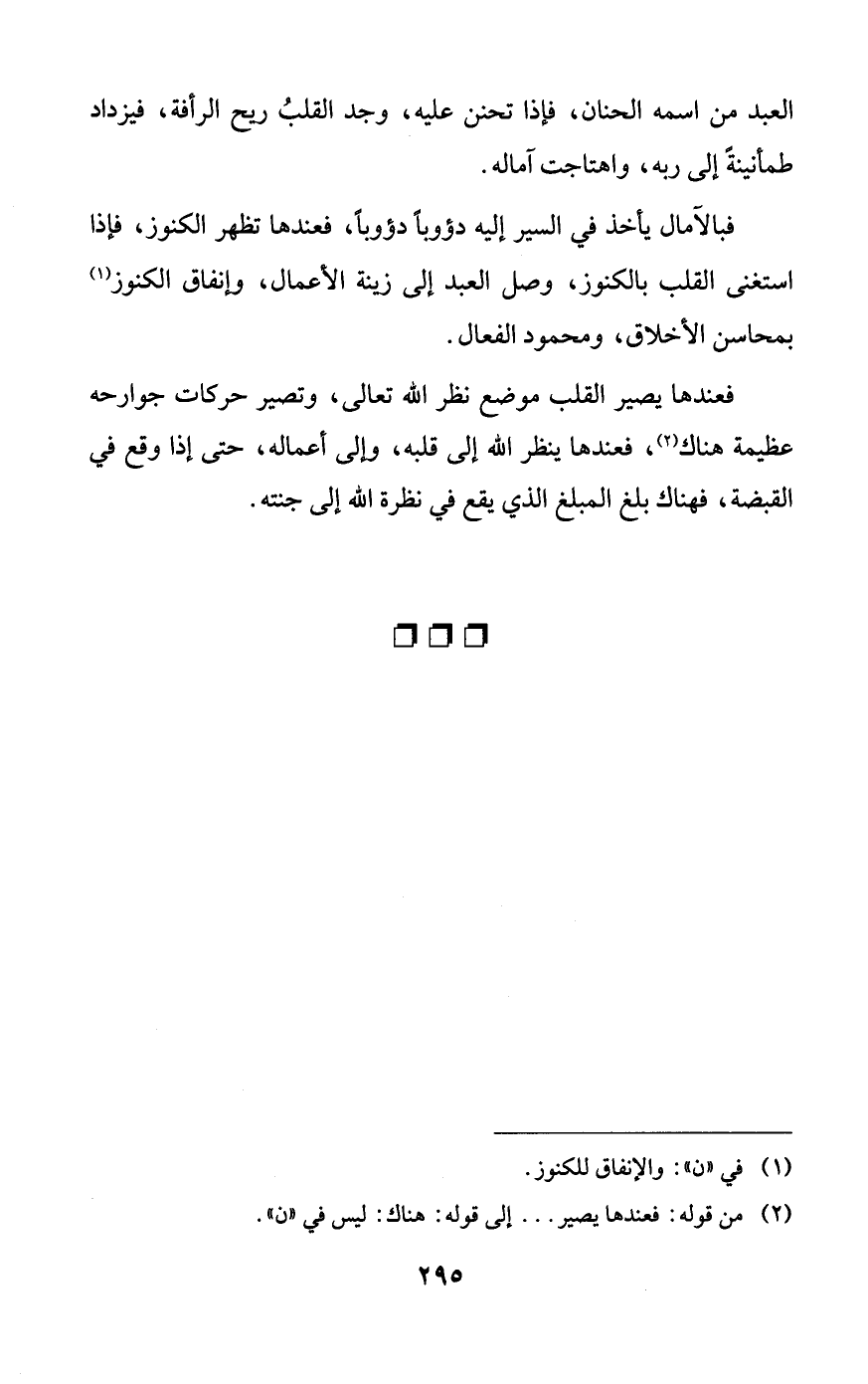 فبالآمال يأخذ في السير إليه دؤوباً دؤوباً، فعندها تظهر الكنوز، فإذا استغنى القلب بالكنوز، وصل العبد إلى زينة الأعمال، وإنفاق الكنوز بمحاسن الأخلاق، ومحمود الفعال.