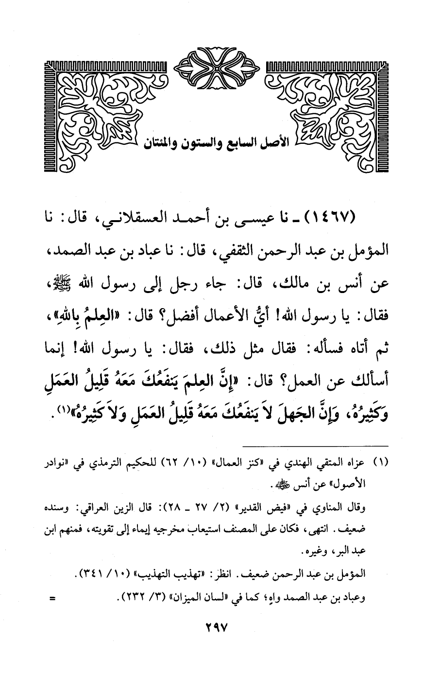 1467 - نا عيسى بن أحمد العسقلاني، قال: نا المؤمل بن عبد الرحمن الثقفي، قال: نا عباد بن عبد الصمد، عن أنس بن مالك، قال: جاء رجل إلى رسول الله صلى الله عليه وسلم، فقال: يا رسول الله! أي الأعمال أفضل؟ قال: ((العلم بالله))، ثم أتاه فسأله، فقال مثل ذلك، فقال: يا رسول الله! إنما أسألك عن العمل؟ قال: ((إن العلم ينفعك معه قليل العمل وكثيره، وإن الجهل لا ينفعك معه قليل العمل ولا كثيره)).