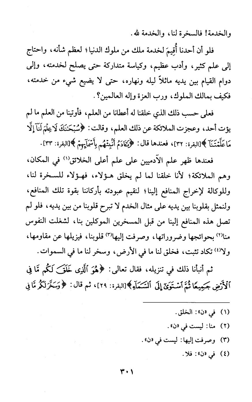 فعندها ظهر علم الآدميين على علم أعلى الخلائق في المكان، وهم الملائكة؛ لأنا خلقنا لما لم يخلق هؤلاء، فهؤلاء للسخرة لنا، وللوكالة لإخراج المنافع إلينا؛ لنقيم عبودته بأركاننا بقوة تلك المنافع، ولنمثل بقلوبنا بين يديه على مثال الخدم لا تبرح قلوبنا من بين يديه، فلو لم تصل هذه المنافع إلينا من قبل المسخرين الموكلين بنا، لشغلت النفوس منا بحوائجها وضروراتها، وصرفت إليها قلوبنا، فيزيلها عن مقاومها، ولا تكاد تثبت، فخلق لنا ما في الأرض، وسخر لنا ما في السماوات.