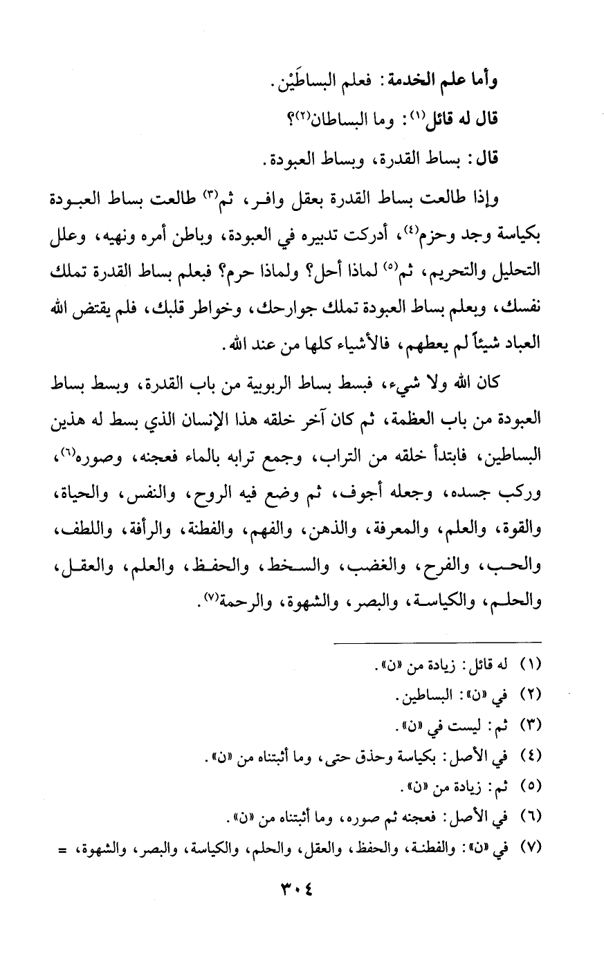 وإذا طالعت بساط القدرة بعقل وافر، ثم طالعت بساط العبودة بكياسة وجد وحزم، أدركت تدبيره في العبودة، وباطن أمره ونهيه، وعلل التحليل والتحريم، ثم لماذا أحل؟ ولماذا حرم؟ فبعلم بساط القدرة تملك نفسك، وبعلم بساط العبودة تملك جوارحك، وخواطر قلبك، فلم يقتض الله العباد شيئاً لم يعطهم، فالأشياء كلها من عند الله.